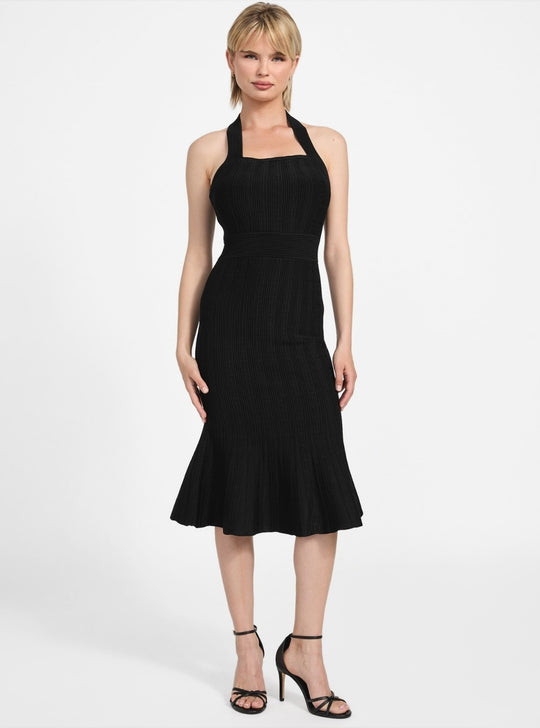 Elevate your look with the Black Halter Strap Sofie Midi Dress. Designed in a figure-flattering knit construction, this sleeveless dress features a chic halter neckline and a flared hem that creates a timeless silhouette. Crafted from a soft viscose blend with added stretch, it ensures comfort and elegance—perfect for both evening occasions and sophisticated daytime wear.
