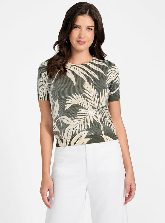 Add a touch of sparkle to your everyday style with the Green Multi Juniper Sequins Sweater. Featuring a tropical-inspired palm leaf pattern with subtle sequin detailing, this knit brings playful texture and shine to your look. Designed with a classic crew neckline, short sleeves, and a relaxed fit, it blends comfort with standout style. Perfect for pairing with denim or skirts for a chic day-to-night outfit.