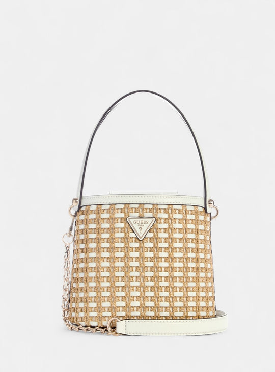 Carry your essentials in style with the Natural White Atalia Raffia Crossbody Bucket Bag. This woven raffia bucket bag features a structured silhouette with a fold-over strap and top zip closure for secure storage. Smooth white PU trim and gold-tone hardware add a refined finish, while the top handle and detachable crossbody strap offer versatile carrying options.