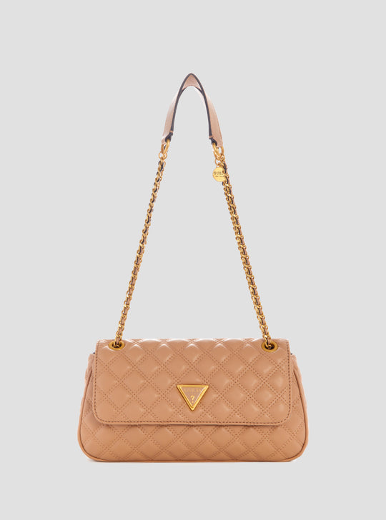Take your look from day to night this season with our Beige Giully Convertible Crossbody Flap Bag. Crafted from a quilted PU base and PU trim, this handbag features antique gold tone hardware, GUESS logo detailing, half flap closure, spacious internal compartment and a convertible chain strap that can be converted from crossbody to shoulder style carrying.