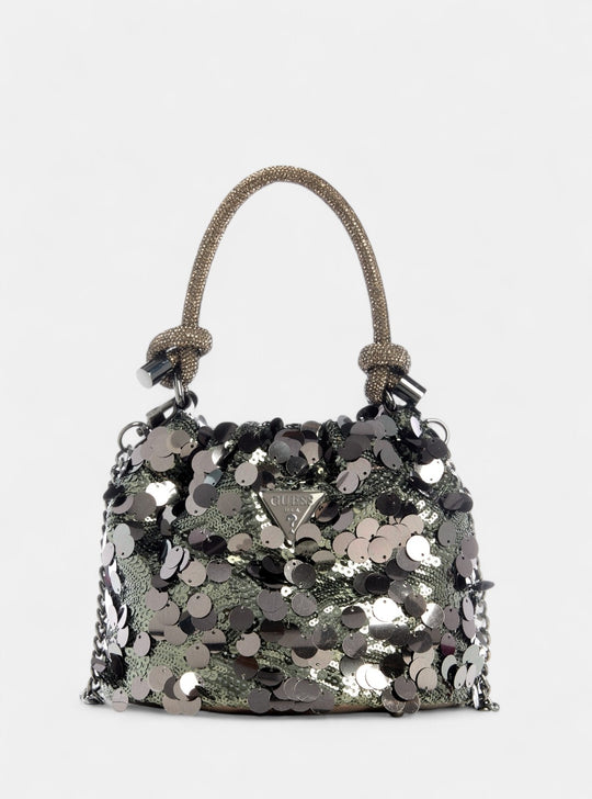 Carry your essentials in style with the Grey Metallic Holiday Shine Top Handle Pouch. Embellished with oversized sequins, this statement evening bag adds instant glamour to your look. The rope-style top handles bring a chic finish, while the drawstring closure keeps your belongings secure. Perfect for parties and special occasions, it’s a standout accessory designed to shine.