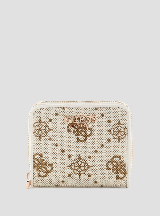 Keep your everyday essentials stylishly in check with the White Logo Neda Small Zip Around Wallet. Featuring the signature GUESS 4G peony logo canvas and shiny gold-tone hardware, this compact wallet offers a chic and practical solution for daily use. With multiple card slots, a coin pocket, and a sleek zip-around closure, it's the perfect accessory to slip into your favourite handbag or carry solo.