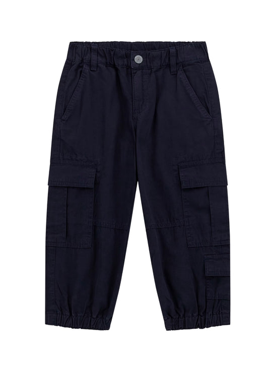 Update his everyday rotation with the Blue Poplin Parachute Cargo Pants (2-7). Made from breathable 100% cotton, these pants combine comfort and durability with a trendy parachute silhouette. Featuring multiple utility pockets, an elastic waistband, and cuffed hems, they’re perfect for active days while keeping a stylish edge. A subtle GUESS logo patch adds the signature finishing touch.