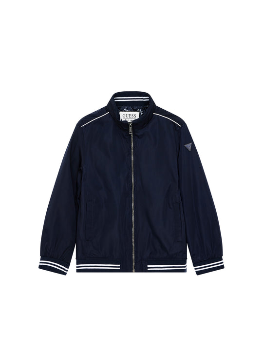 Keep him looking sharp and feeling comfortable with this Eco Blue Bomber Mini Me Jacket (7-16). Designed with sporty striped ribbed trims and a sleek zip-up front, this jacket adds a cool, versatile layer to any outfit. Its lightweight polyester fabric makes it perfect for year-round wear, whether for casual days out or special occasions.