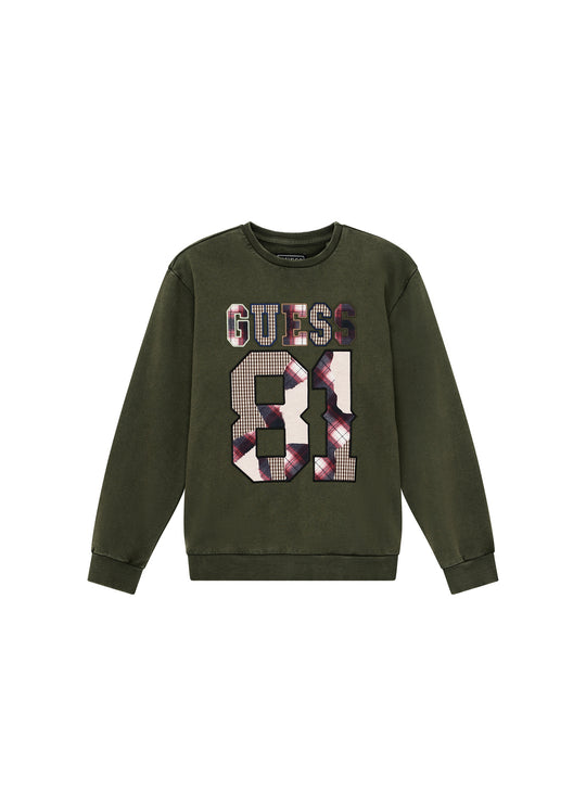 Bring sporty style to his everyday look with this Eco Green 81 Logo Long Sleeve T-Shirt (7-16). Featuring bold “GUESS 81” varsity-style lettering with plaid accents, this top adds a cool and casual vibe perfect for school or play. Crafted from soft 100% cotton, it offers all-day comfort and easy movement.