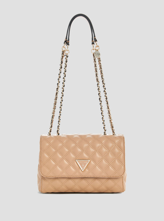 Make a statement with the Beige Giully Convertible Crossbody Flap Bag. With its luxurious quilted texture, gold-tone hardware, and signature triangle logo, this convertible bag brings effortless sophistication. Featuring a dual-length chain strap and flap closure, it’s perfect for day-to-night styling with polished charm.