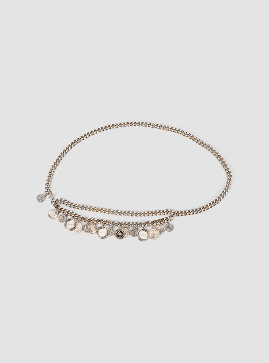 Add a statement touch to your look with the Gold Coin Waist Belt. Designed with a double chain silhouette, this eye-catching accessory features dangling coin charms for a bold, stylish finish. Crafted in pale gold-toned metal, it fastens with a secure carabiner clasp and pairs perfectly with dresses, skirts, or high-waisted trousers for a fashion-forward edge.