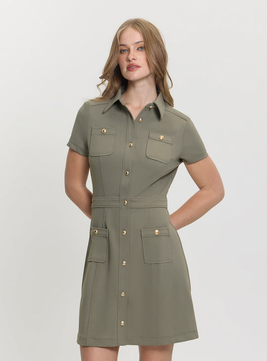 Add tailored charm to your wardrobe with the Green Elora Pockets Mini Dress. This short-sleeve mini dress features a structured fit with a shirt collar, gold-tone button-through front, and four functional pockets for a utilitarian-meets-feminine vibe. The stretch fabric offers comfort and flexibility, making it an ideal choice for both day outings and smart-casual settings.