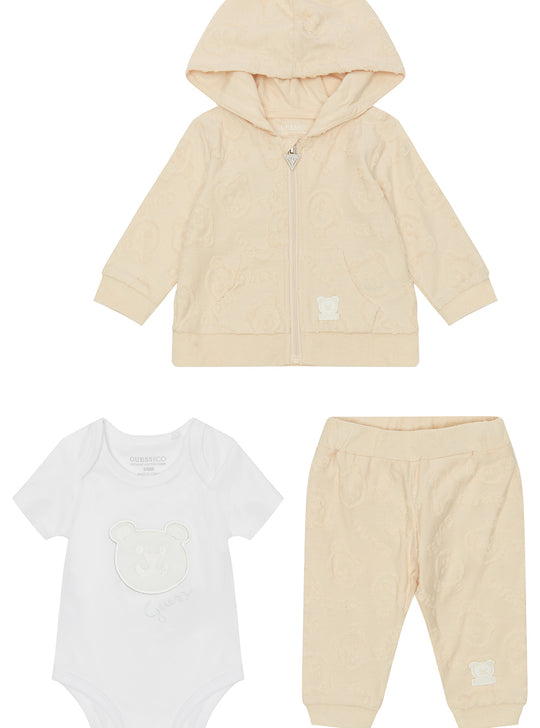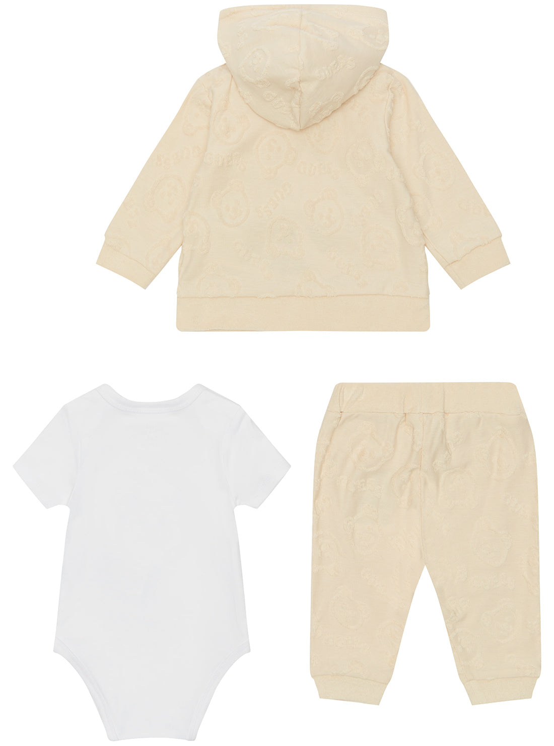 Introducing our GUESS Kids Beige 3 Piece Set - the perfect blend of style and comfort! This cotton set includes a hooded jacket with a zip fastening, cuffed pants with an elastic waistband, and a bodysuit with cute front embroidery. Featuring an all-over teddy bear and logo design, this set will keep your little one looking adorable.