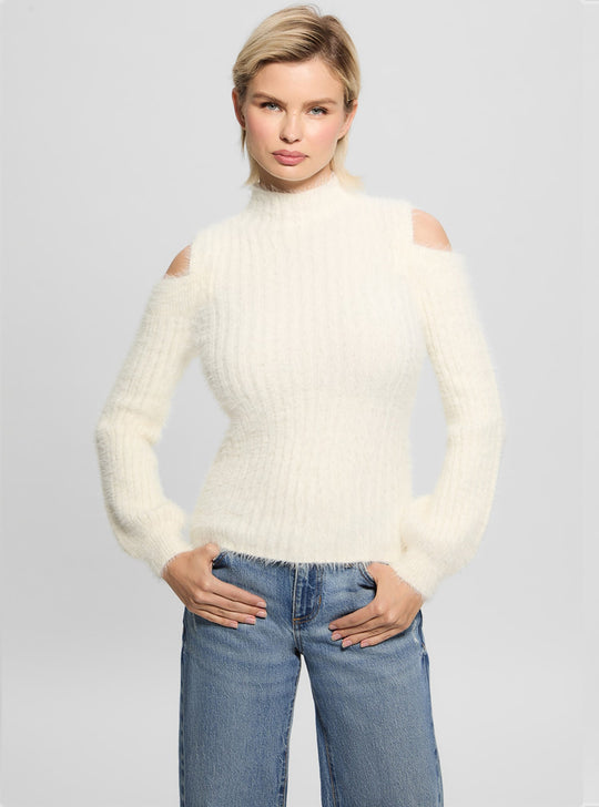 Step out in style with our Beige Fuzzy Takara Knit Top! This top features long sleeves and trendy shoulder cutouts for a playful twist. The bell sleeves add a unique touch, while the high neckline keeps you warm and chic. Don't miss out on this quirky and versatile piece.