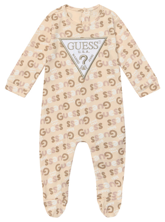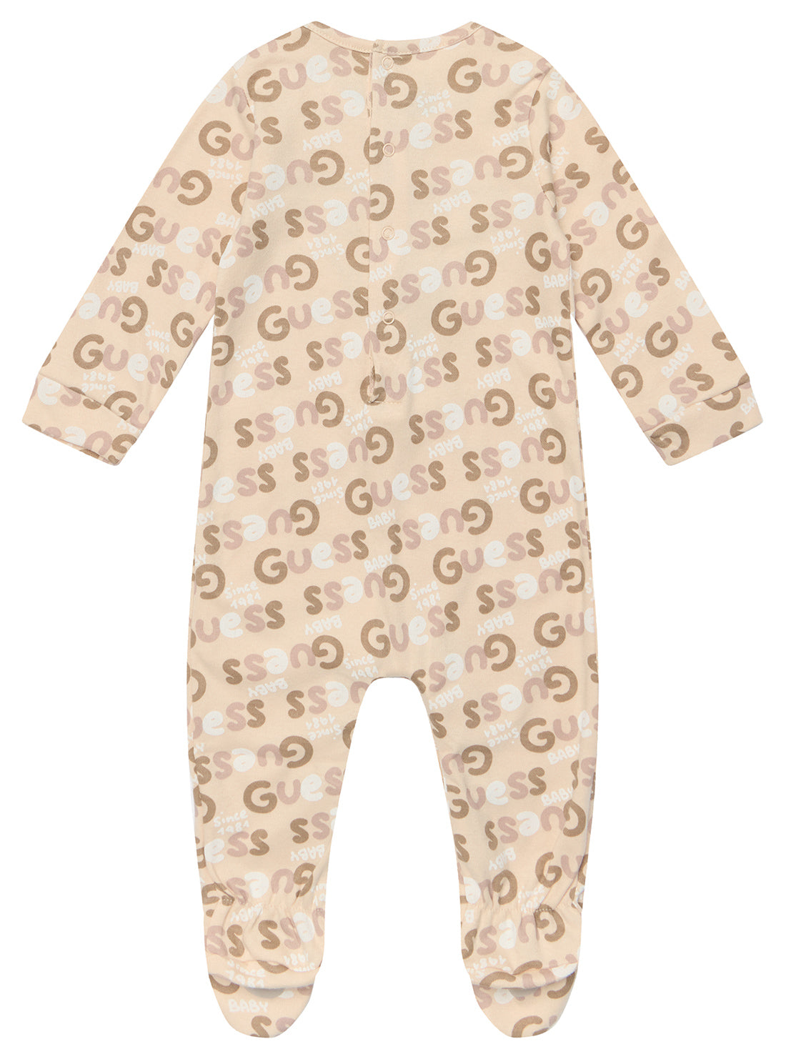 Get your little one ready for stylish adventures with the Beige Interlock Overall Onesie by GUESS Kids! Made with 100% cotton, this cosy onesie features long sleeves and a snap closure at the back for easy dressing. The all over GUESS print and Triangle Logo add a touch of playful charm. Perfect for infants 0-12 months old.