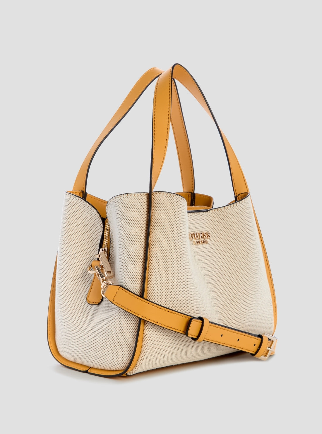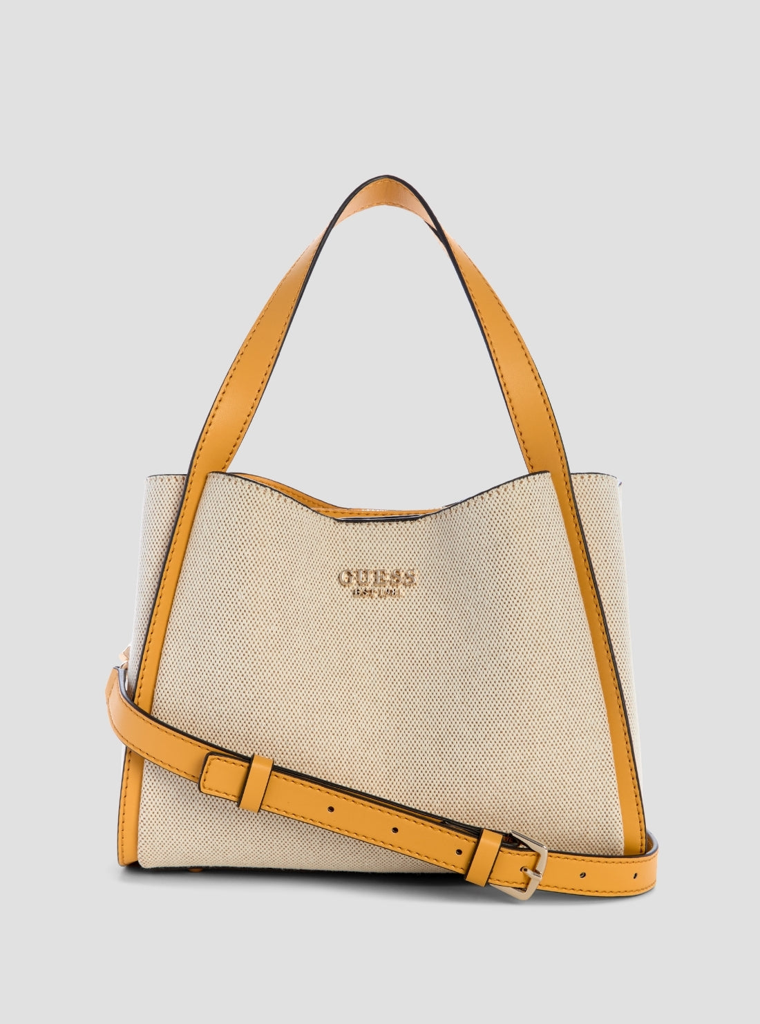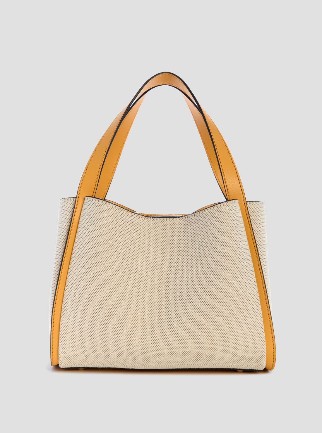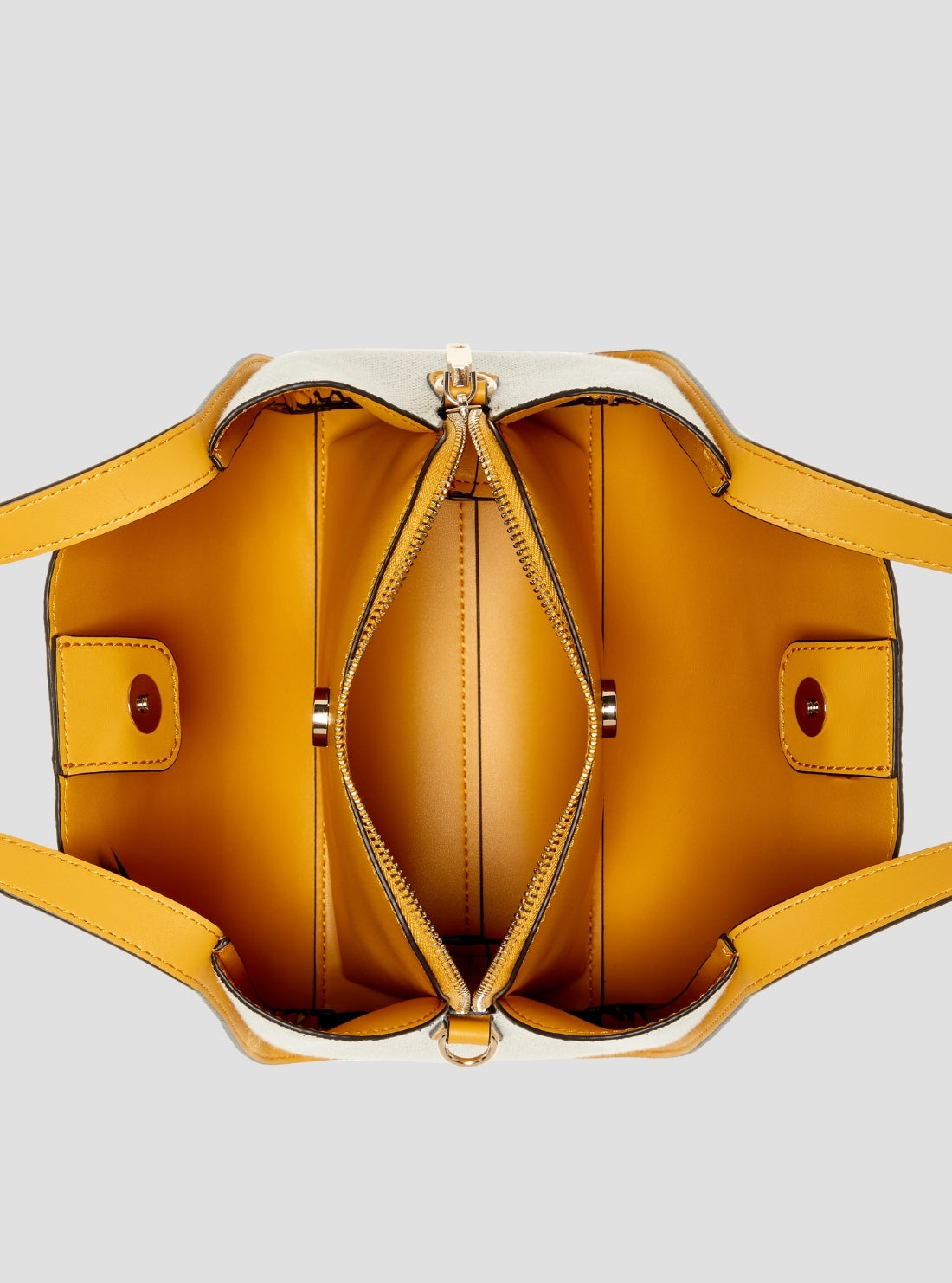 Brighten up your everyday look with the Beige Yellow Nicolette Small Girlfriend Satchel. Crafted from durable canvas and accented with double-faced pebble PU trim, this compact satchel offers a structured silhouette and a pop of colour. Featuring shiny gold-tone hardware, a secure top zip closure, and dual carrying options, it’s perfect for brunch dates, weekend strolls, or casual outings.