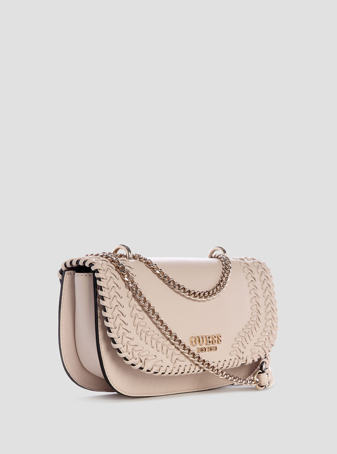 Add a chic touch to your look with the Beige Tatum Convertible Crossbody Flap Bag by GUESS. Featuring a flap magnetic closure and a stylish chain and leatherette strap, this compact crossbody is perfect for day-to-night wear. The whipstitch trim along the flap and strap adds a subtle yet sophisticated detail, making it ideal for casual outings or evening events.