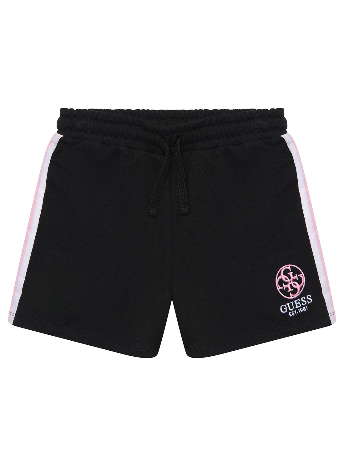 Made for movement and designed with style, the GUESS Active Shorts are the perfect go-to for active kids. Crafted from soft, breathable 100% cotton, these jet black shorts feature an elasticated waistband with an adjustable drawstring for the perfect fit. Pale pink side stripes and an embroidered GUESS logo add a sporty and stylish touch, ideal for playtime, casual outings, or everyday wear.