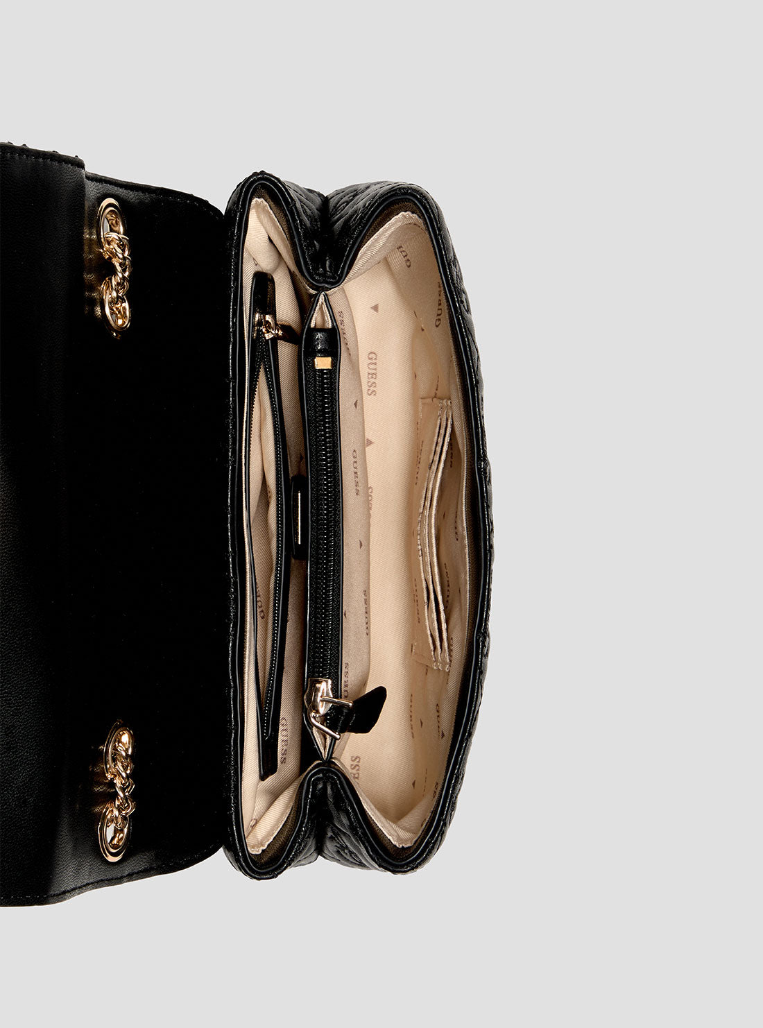 Unleash your wild side with the Black Adelasia Convertible Crossbody Bag! Effortlessly transition from shoulder bag to crossbody with the dual handles. The half flap closure keeps your belongings secure while the quilted smooth PU and shiny gold hardware add a touch of glamour.