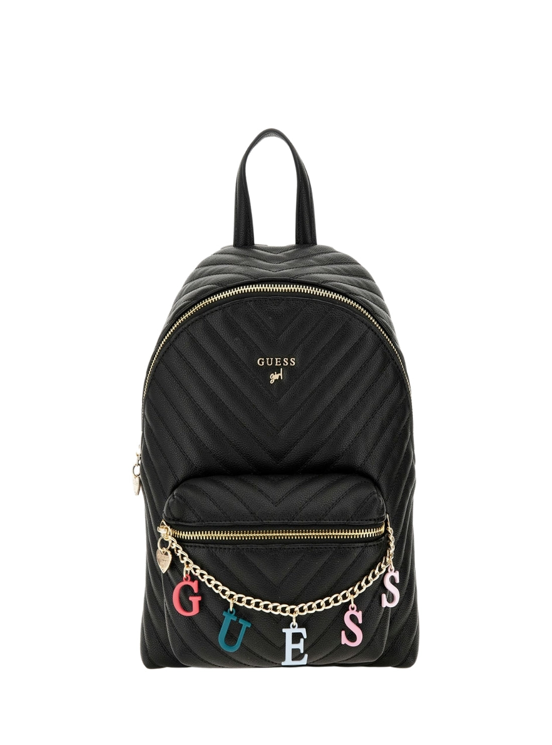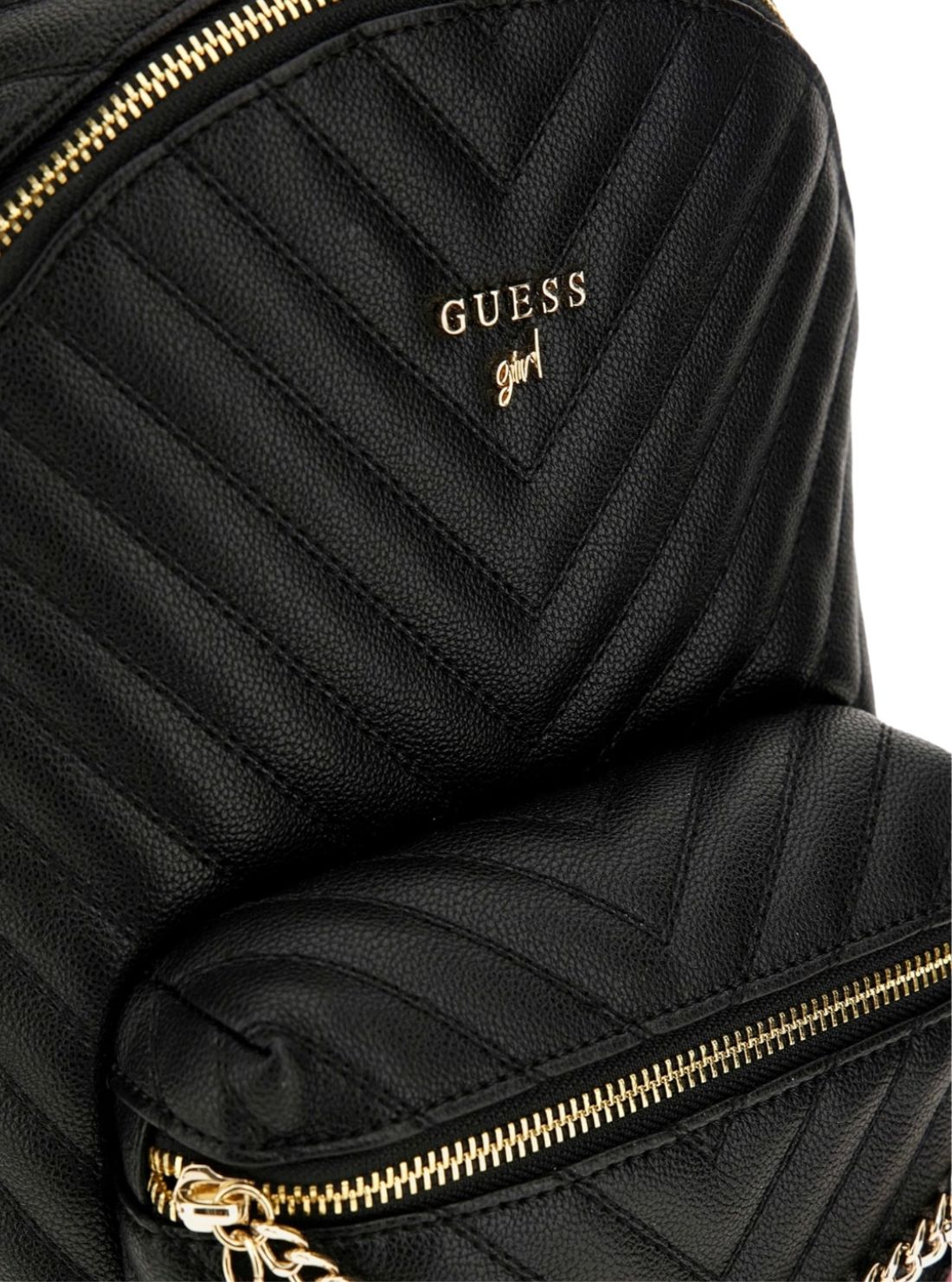 GUESS Kids Black Chain Lattering Small Backpack J4RZ17WFZL0 Front View GUESS Kids Black Chain Lattering Small Backpack J4RZ17WFZL0 Detail View GUESS Kids Black Chain Lattering Small Backpack J4RZ17WFZL0 Back View