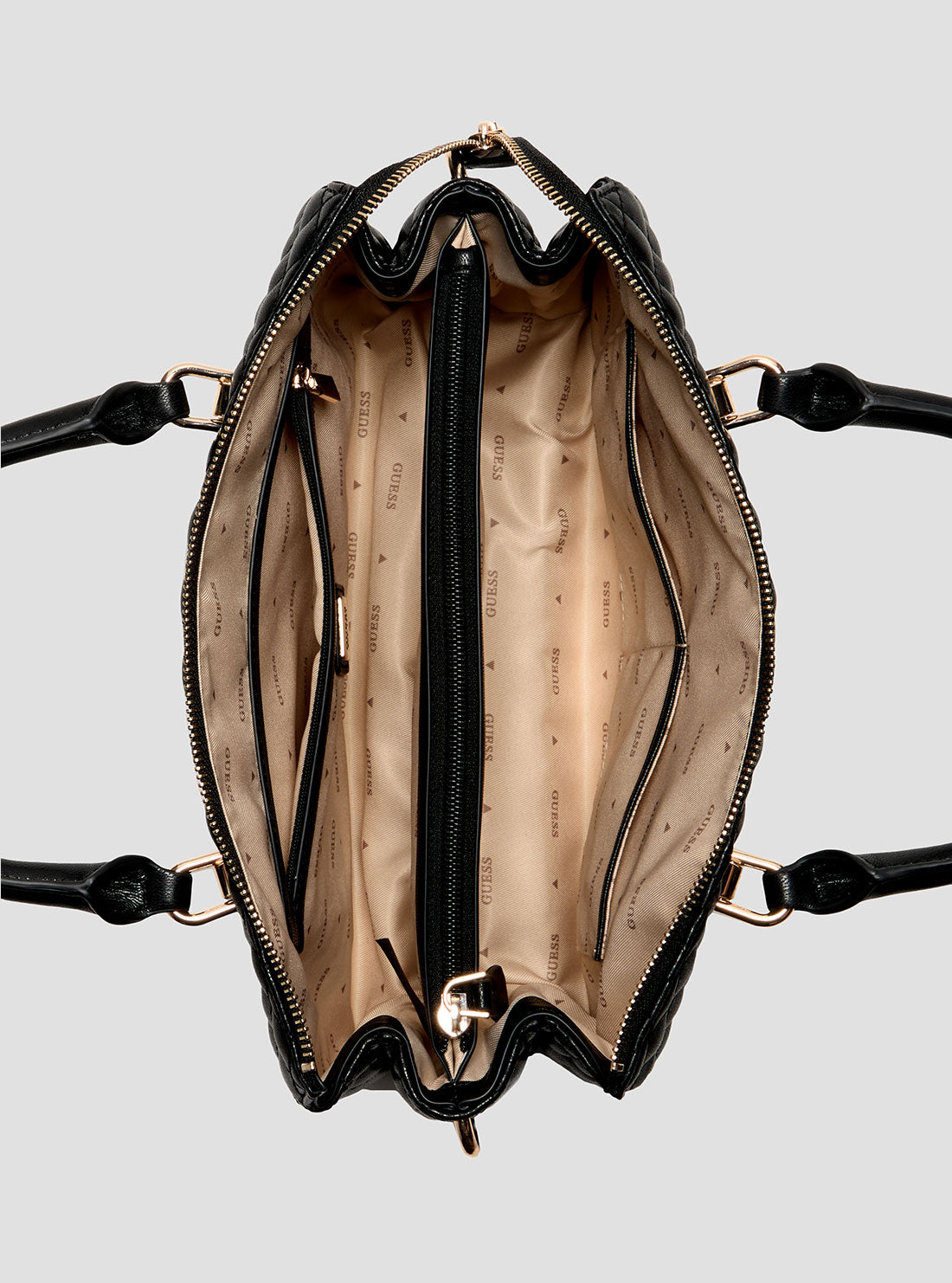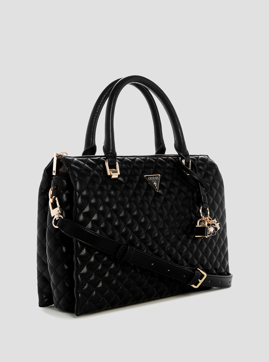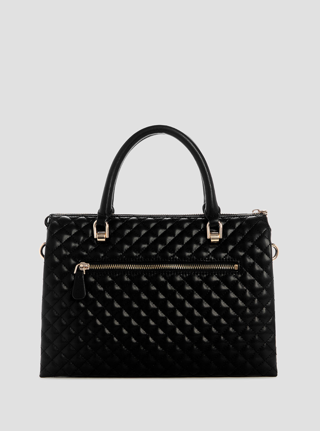 Get ready to turn heads with our Black Everlee Girlfriend Satchel Bag by GUESS! Designed with a top handle for easy carrying and multiple compartments for effortless organization, this bag is both practical and stylish. The base and trim feature a luxurious quilted pebble PU texture, finished with shiny gold hardware for a touch of glam.