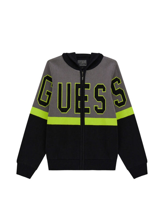 Keep him warm and on-trend in this Black Full Zip Hooded Sweater (7-16). Featuring bold GUESS logo lettering across the chest and sleeves with high-contrast neon accents, this hoodie delivers standout style with everyday comfort. The ribbed hem and cuffs help lock in warmth, while the full zip makes layering a breeze.
