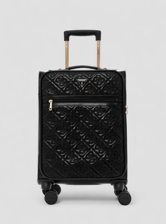 Travel in style with the Black Logo Adelasia 45cm Suitcase. This 18-inch cabin-size trolley is crafted from smooth quilted PU, showcasing the iconic GUESS 4G embossed pattern for a luxe finish. It features an 8-wheel spinner system for smooth mobility, a secure zip-around closure, internal straps for organized packing, and a TSA-approved combination lock for added security. The shiny gold hardware and telescopic handle complete the look, making it your perfect travel companion for short getaways or business trips.