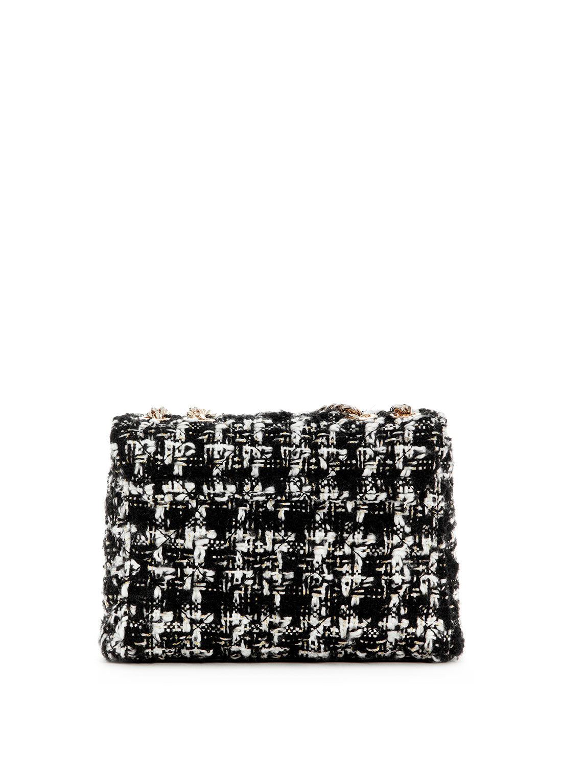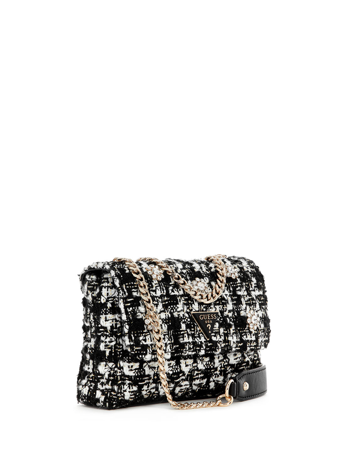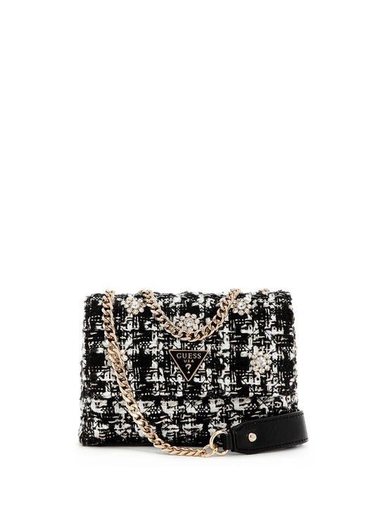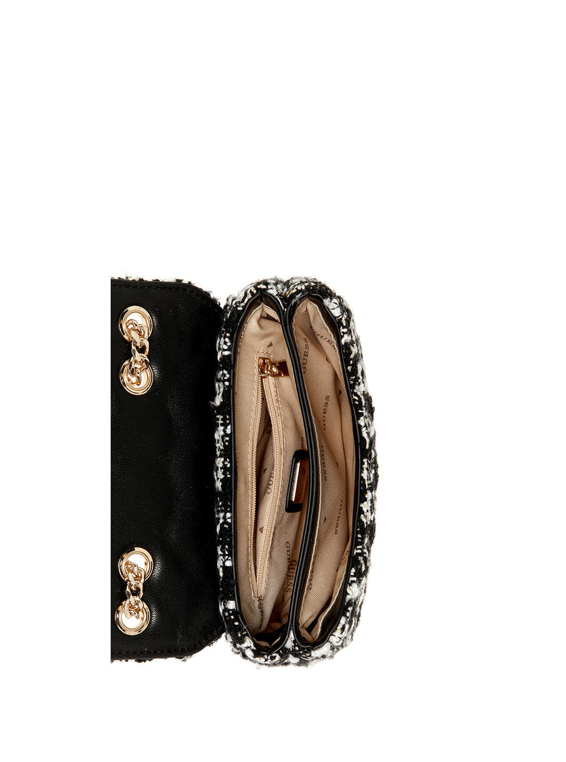 Elevate your style with our Black Mini Crossbody Flap Bag by GUESS! This adorable accessory features quilted tweed fabric with smooth PU trim for a polished finish. The secure flap closure keeps your essentials safe, while the shiny gold hardware adds a touch of glam.