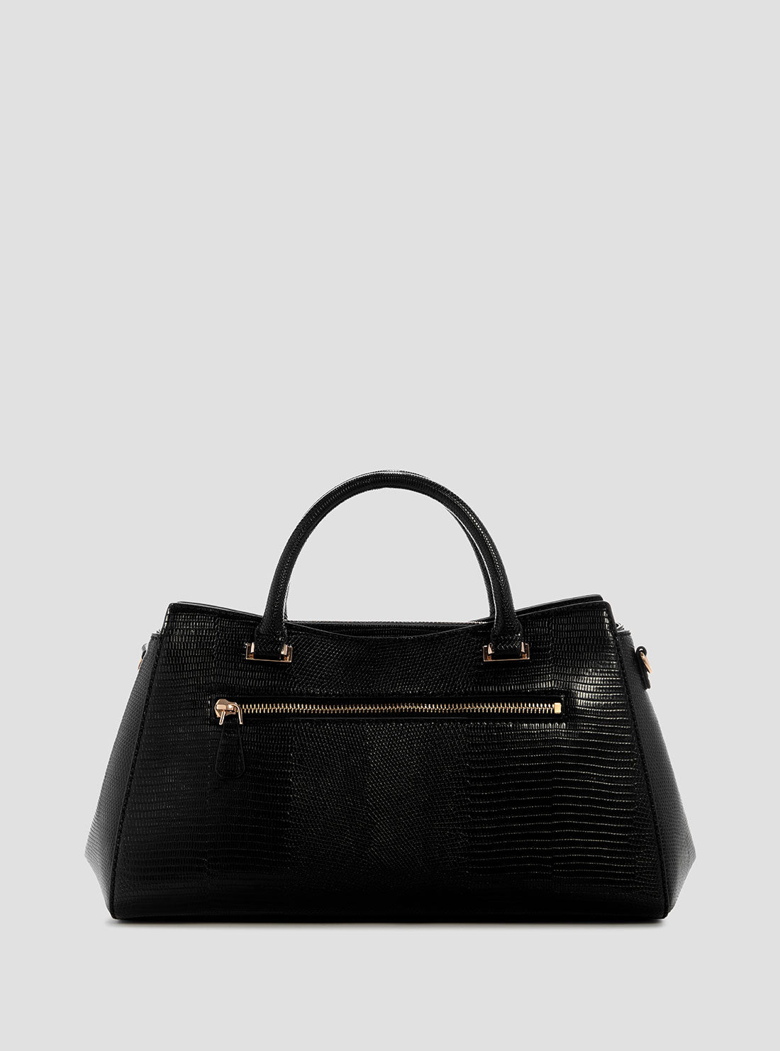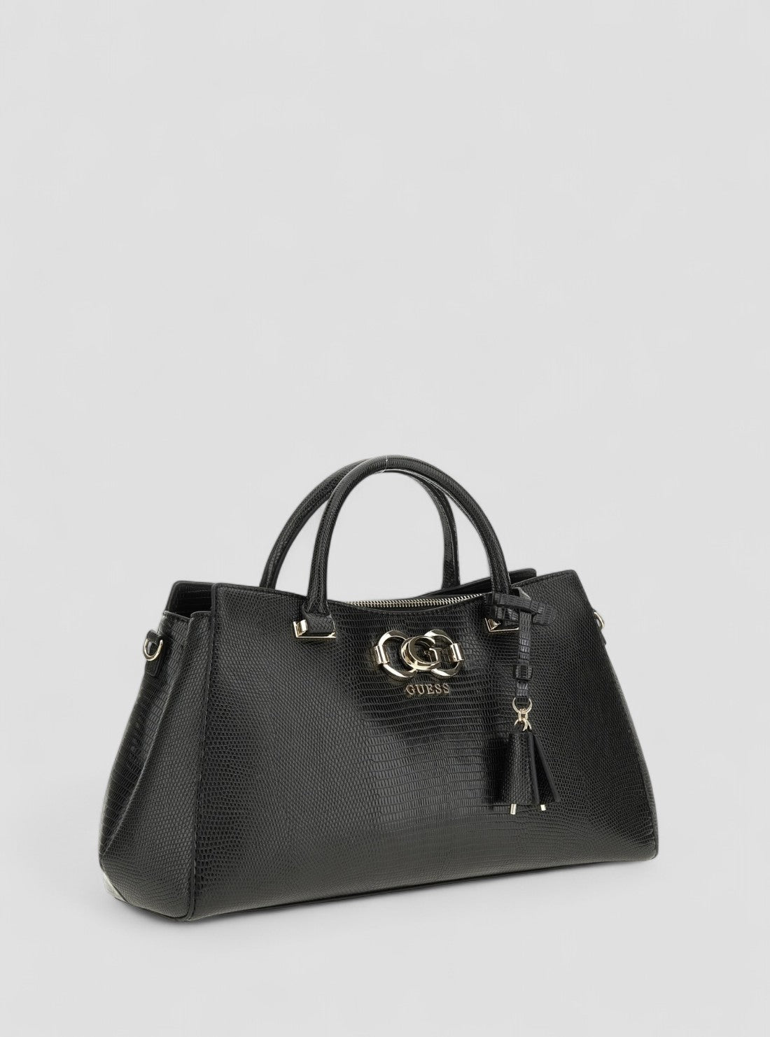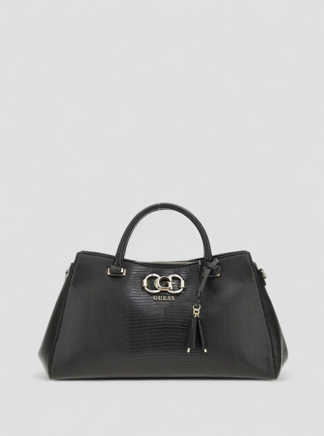 Get ready to turn heads with the Black Salinge Luxury Satchel Bag by GUESS! This stunning bag features dual top handles and an adjustable crossbody strap for versatility. The base is made of lizard PU, while the trim and hardware have a shiny gold finish. Make a statement with this stylish and chic bag.