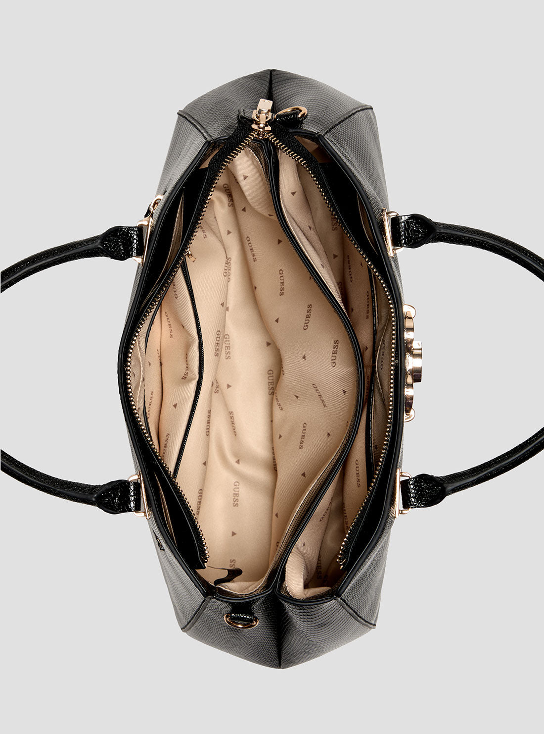 GUESS Womens Black Salinge Luxury Satchel Bag KG962406 Front View GUESS Womens Black Salinge Luxury Satchel Bag KG962406 Front Side View GUESS Womens Black Salinge Luxury Satchel Bag KG962406 Inside View GUESS Womens Black Salinge Luxury Satchel Bag KG962406 Back View