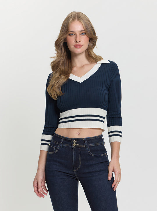 Add sporty elegance to your everyday style with the Blackened Blue Sydney Polo Sweater, a cropped knit that blends comfort and polish. Designed with a flattering V-neckline and long sleeves, this sweater features subtle stripe detailing at the hem for a modern, athletic-inspired finish. Perfect pairing with high-waisted jeans, trousers, or a fitted skirt for an effortlessly chic look.