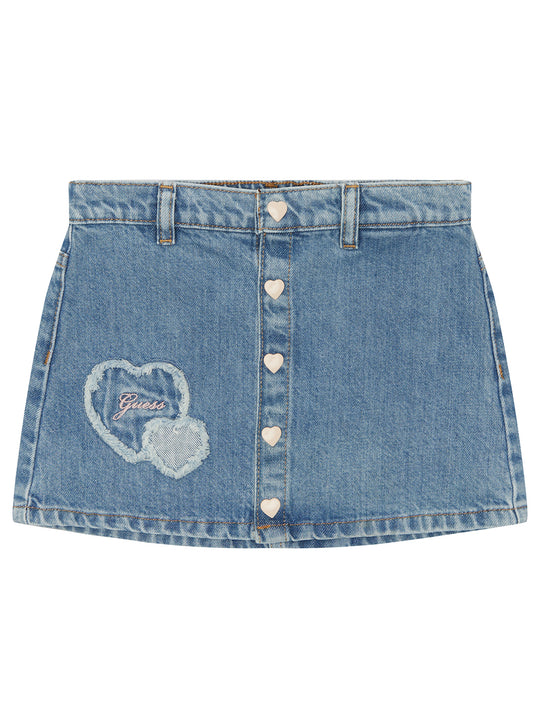 Get your little one ready for a stylish adventure with the GUESS Kids Blue Denim Mini Skirt. Made with 100% cotton, this mini skirt features a heart button closure and an elasticated waistband for maximum comfort. The embroidered details add a fun touch to this must-have piece.