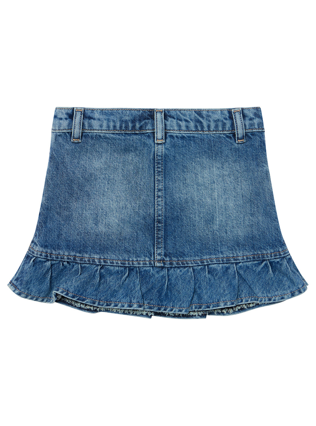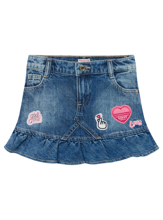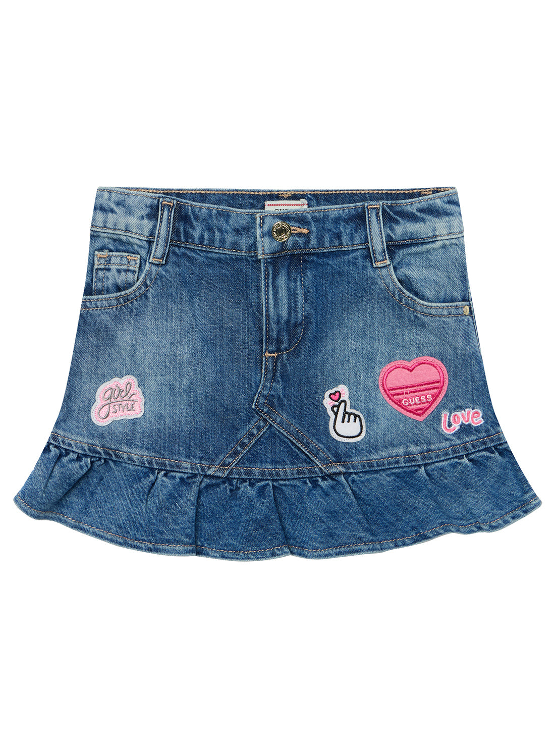 Rock the playground with the GUESS Kids blue denim mini skirt. Made from 100% cotton, this mini skirt features embroidered patch details and dual pockets for a fun and playful look. Perfect for your little fashionista.