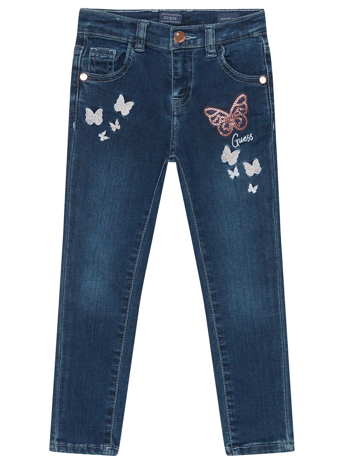 Get your little one ready to flutter in style with these GUESS Kids Blue Denim Skinny Leg Jeans! Featuring an embroidered butterfly and sequinned details, these jeans are both fun and fashionable. Made with stretch denim for a comfortable fit, these jeans will keep your child on trend.