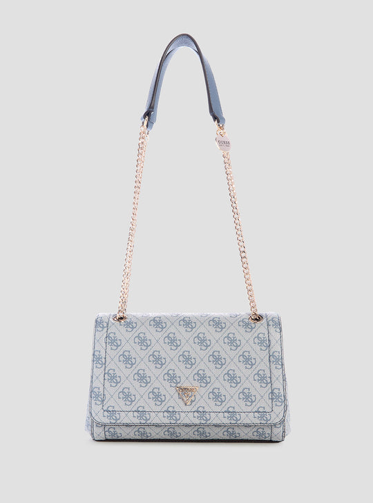 Make a timeless statement with the Blue Logo Noelle Convertible Crossbody Flap Bag. Designed in an all-over blue 4G logo print, this structured piece features a flap-front silhouette accented with gold-tone hardware and the signature GUESS triangle logo. The dual chain-and-faux-leather straps add a polished edge and can be worn crossbody or over the shoulder for versatile styling. Perfectly sized to hold your daily essentials, it’s the ideal blend of elegance and functionality.