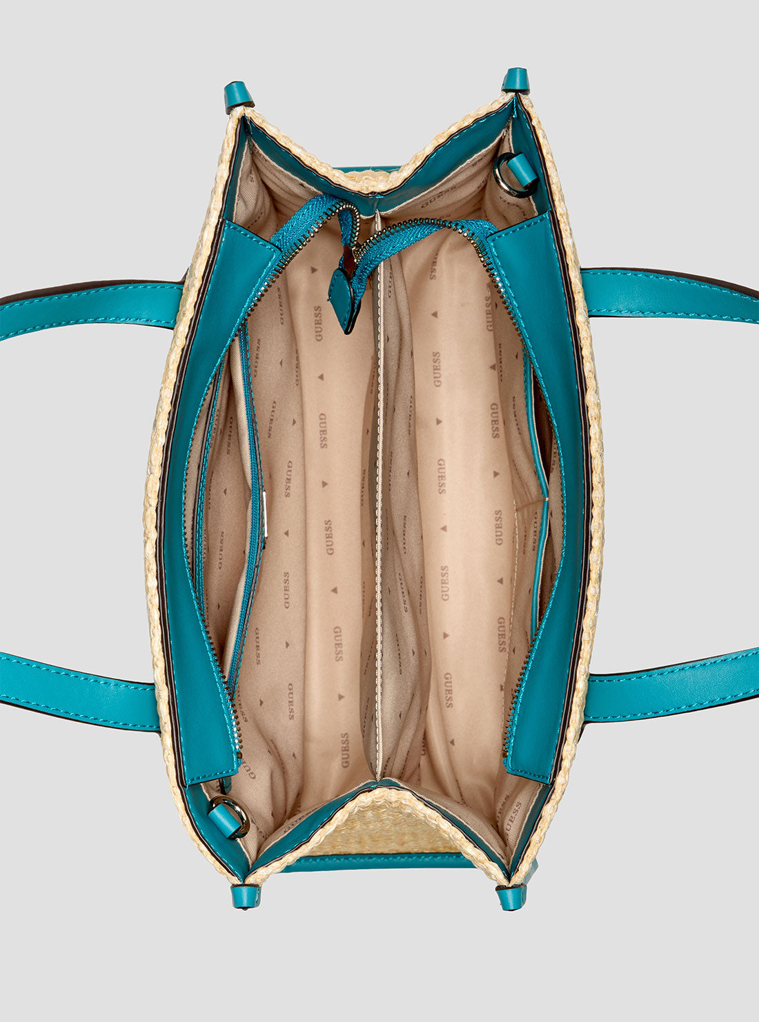 Carry your essentials in effortless style with the Blue Logo Silvana Double Compartment Tote. This ombre-logo raffia bag features dual compartments and a secure top zip closure for everyday practicality. Smooth PU trim and shiny gold hardware add a refined touch, while dual carrying options, top handles, and a detachable crossbody strap make it as functional as it is fashionable.