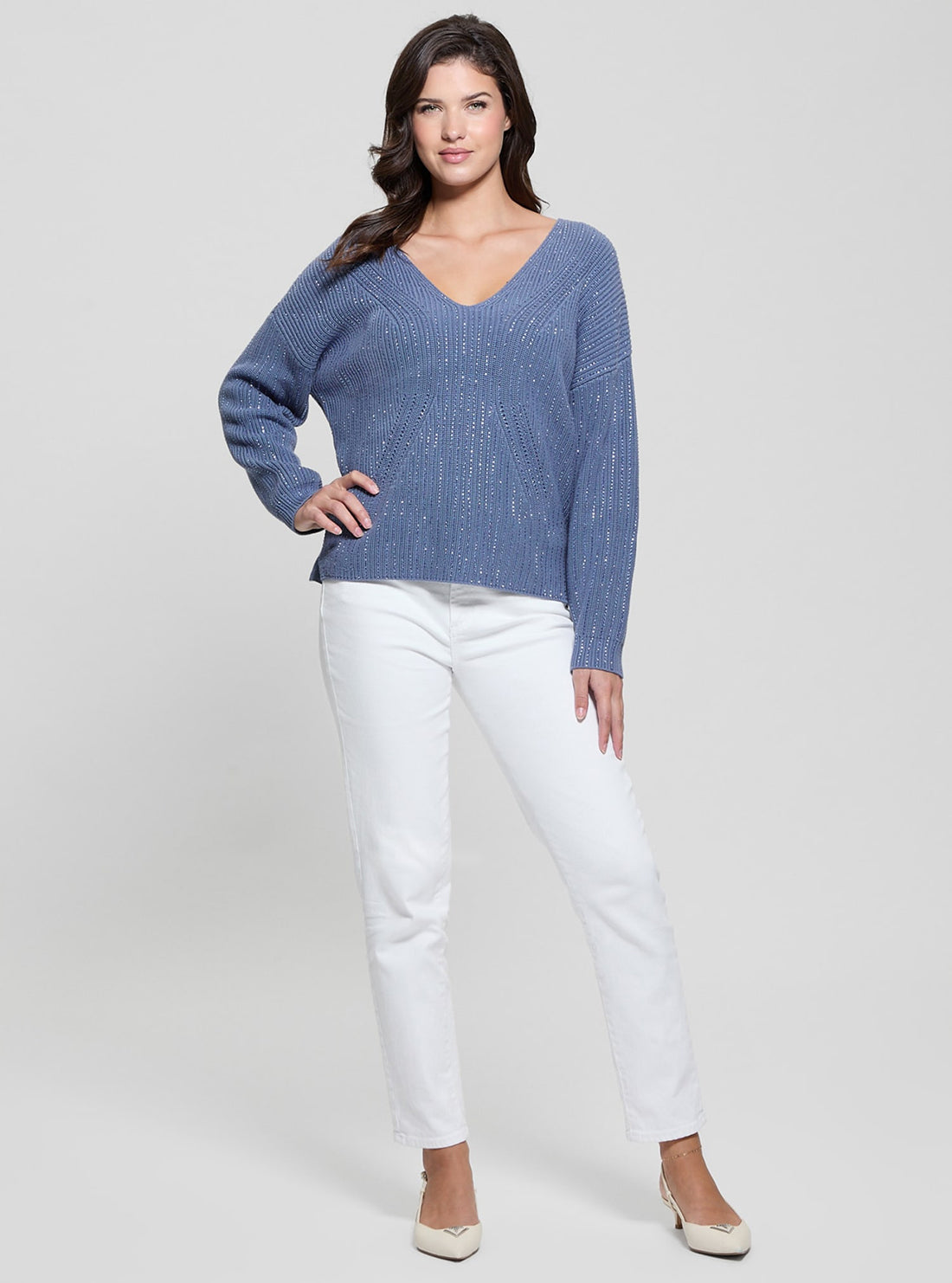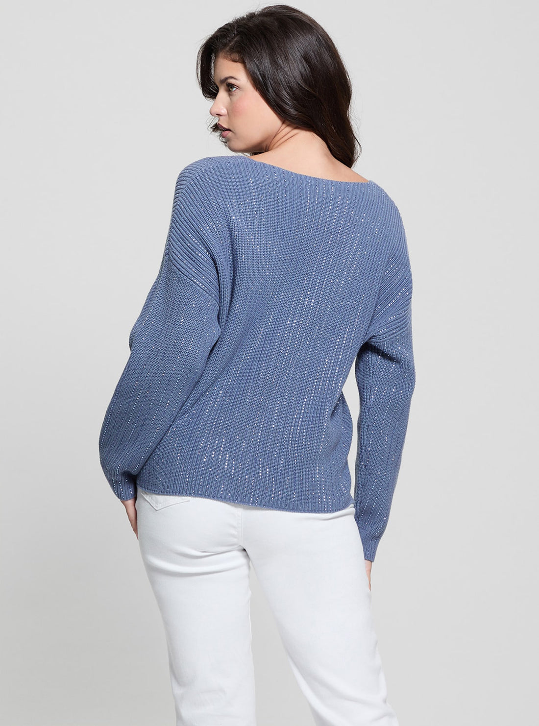 Stay cozy in the Blue Lorien Knit Top. Its long sleeves offer warmth while the V-neckline adds a touch of style. Made with 100% cotton, this top is perfect for those chilly days, ensuring both comfort and fashion.