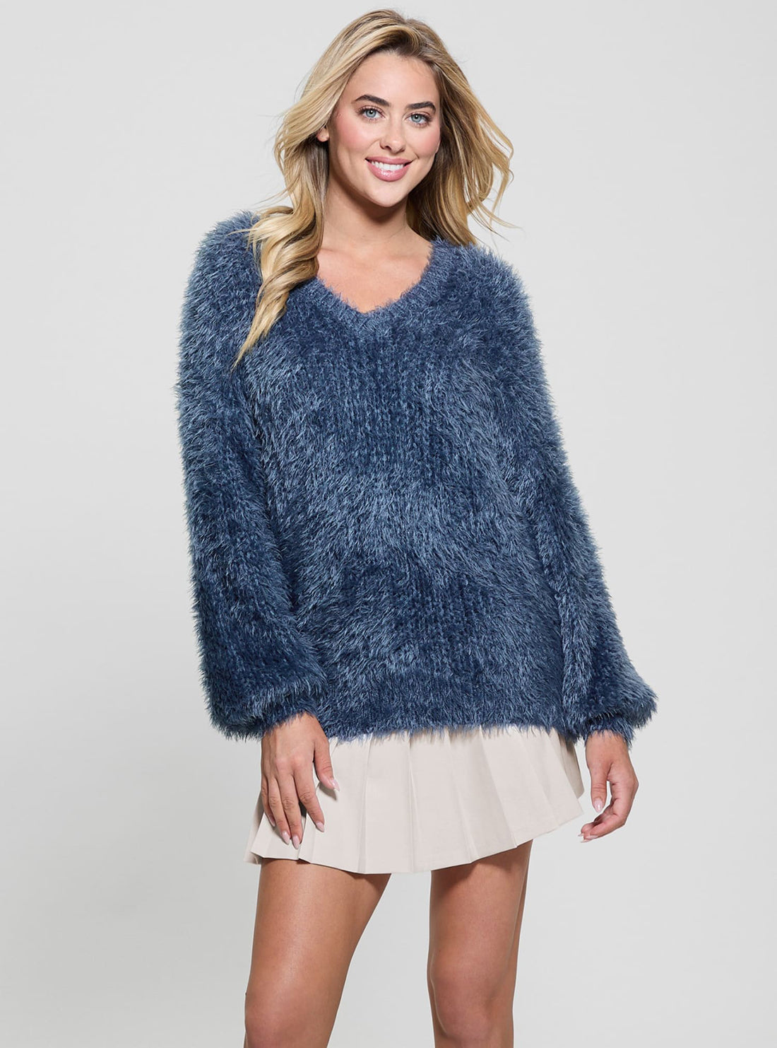 Get ready to snuggle up in this Blue Natsumi Knit Jumper! With its long sleeves and v-neckline, it's perfect for chilly days. Plus, the fuzzy material will keep you warm and cozy. Stay stylish and comfortable at the same time, what more could you ask for?
