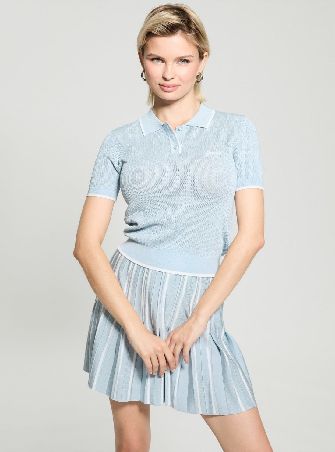 Refresh your everyday wardrobe with the Blue Open-Knit Active Polo Sweater, a polished essential with sporty-chic appeal. Crafted from soft open-knit fabric, this short-sleeve polo features a folded collar, stripe-tipped trim, and a button placket for a refined finish. The embroidered chest signature adds a subtle branded touch. Perfect pairing with high-rise trousers, skirts, or matching sweater pants for a cohesive and stylish look.