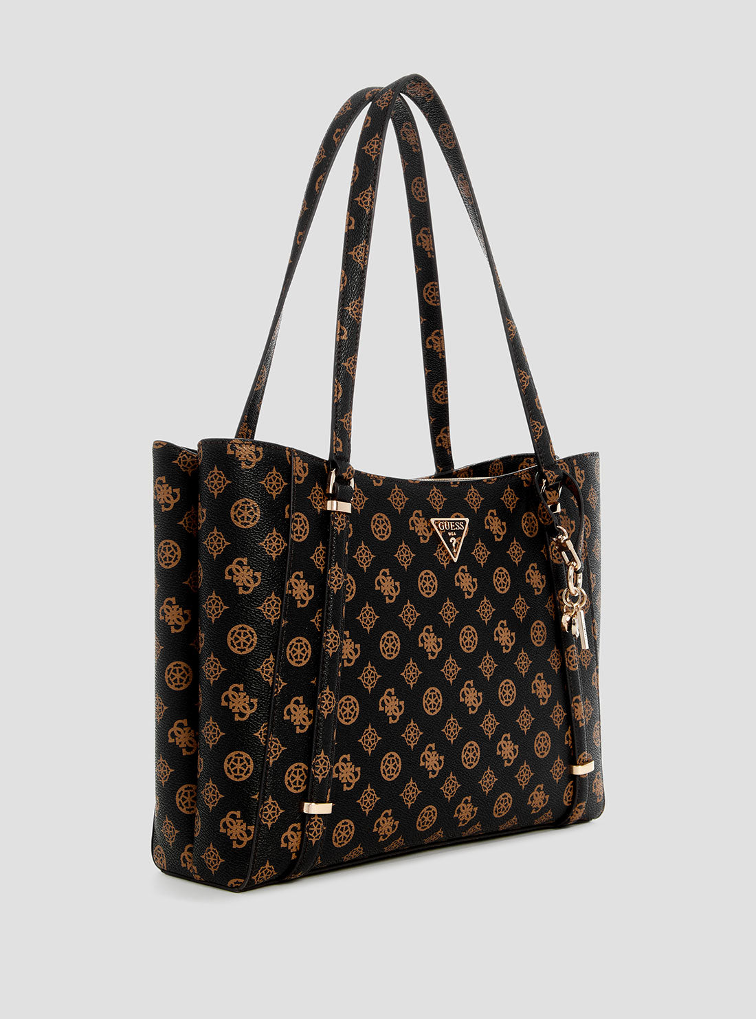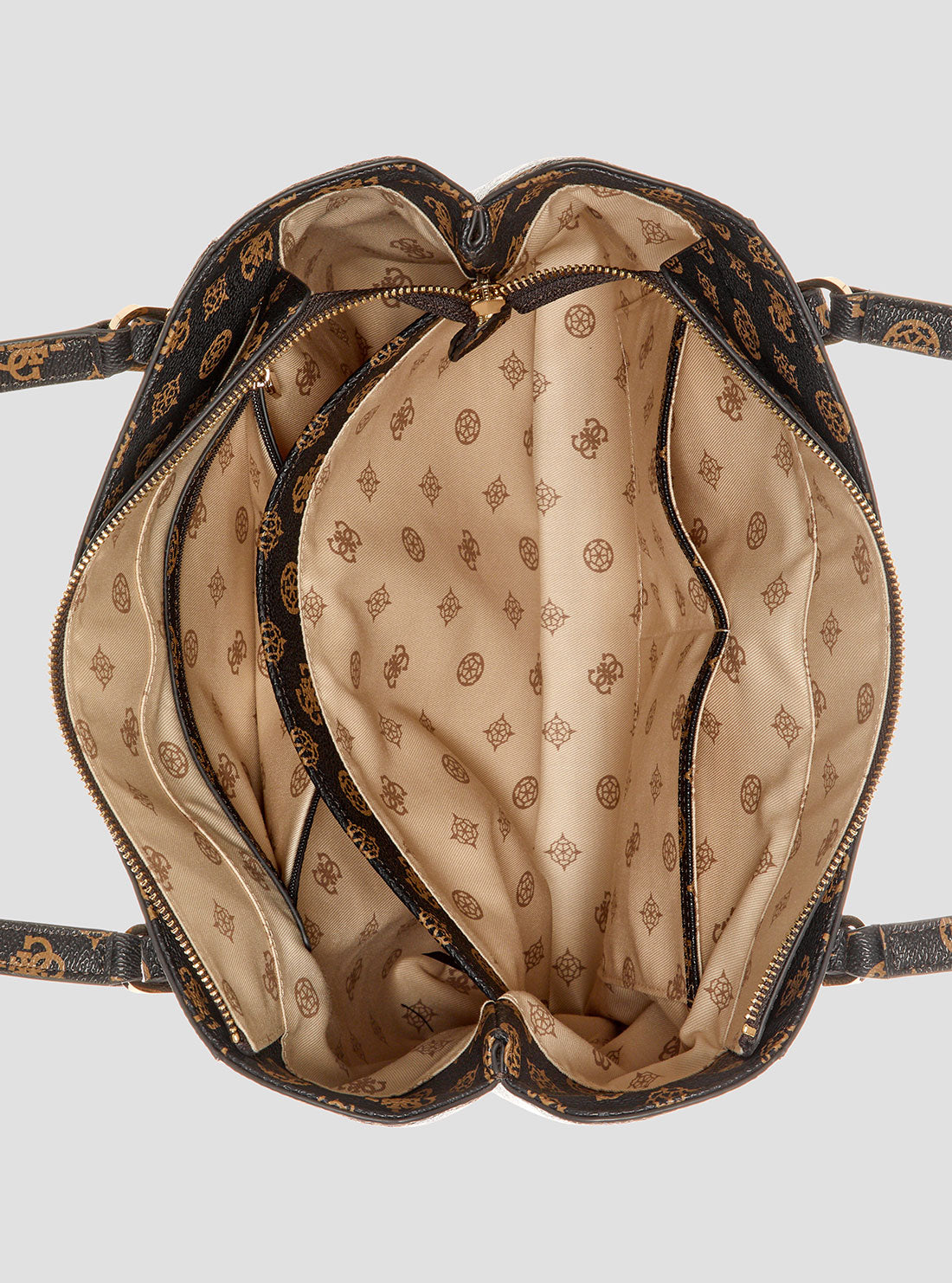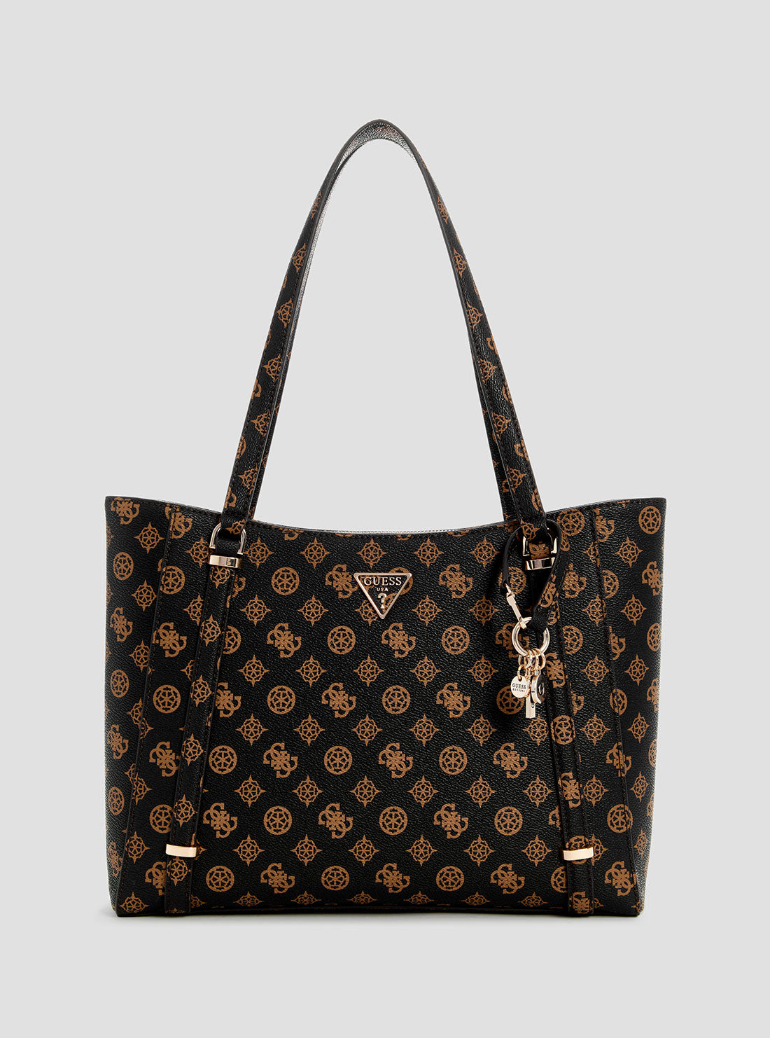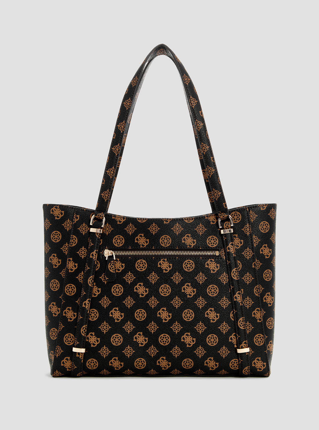 Get ready to turn heads with our Brown Logo Daryna Elite Tote Bag. This stylish and functional bag features a shoulder strap, multiple compartments, and a base printed with a beautiful peony design. The trim is made of self fabric and the hardware is a shiny gold, adding an extra touch of elegance. Perfect for any occasion!