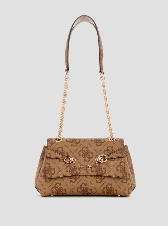 Meet the Brown Logo Lorelei Crossbody Bag! With a flap closure, chain crossbody strap, and all-over logo, this bag is perfect for all your essentials. The oversized basique PU base and shiny gold hardware add a touch of luxury. It's a must-have for any fashion-forward individual.