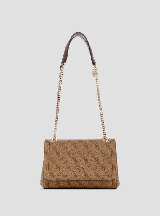 Make a timeless statement with the Brown Logo Noelle Convertible Crossbody Flap Bag. Designed in an all-over latte brown 4G logo print, this structured piece features a flap-front silhouette accented with gold-tone hardware and the signature GUESS triangle logo. The dual chain-and-faux-leather straps add a polished edge and can be worn crossbody or over the shoulder for versatile styling. Perfectly sized to hold your daily essentials, it’s the ideal blend of elegance and functionality.