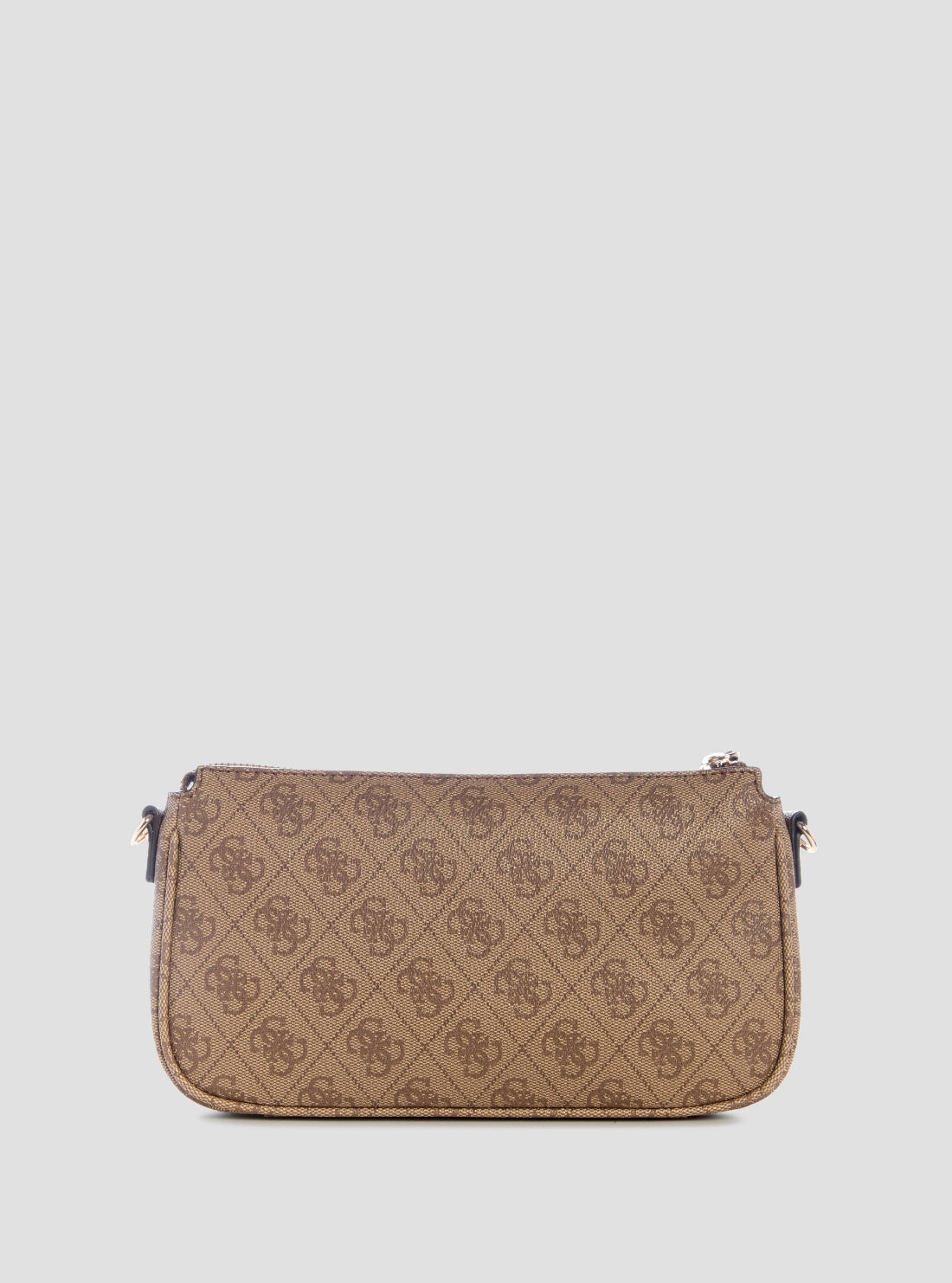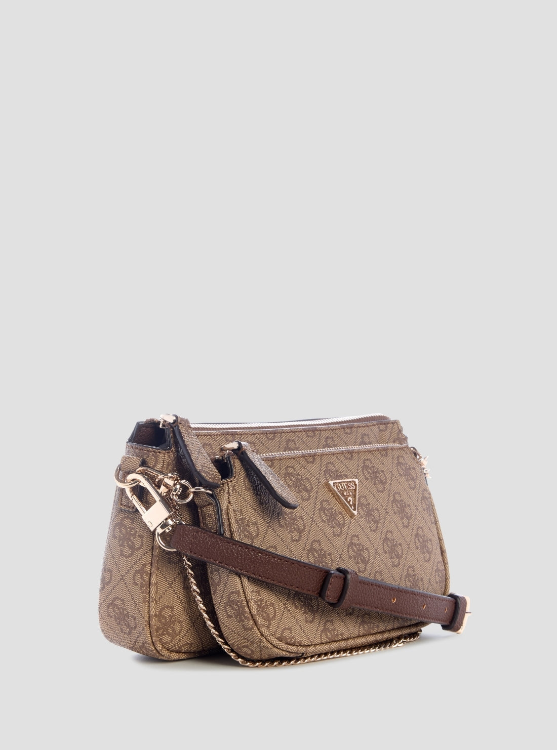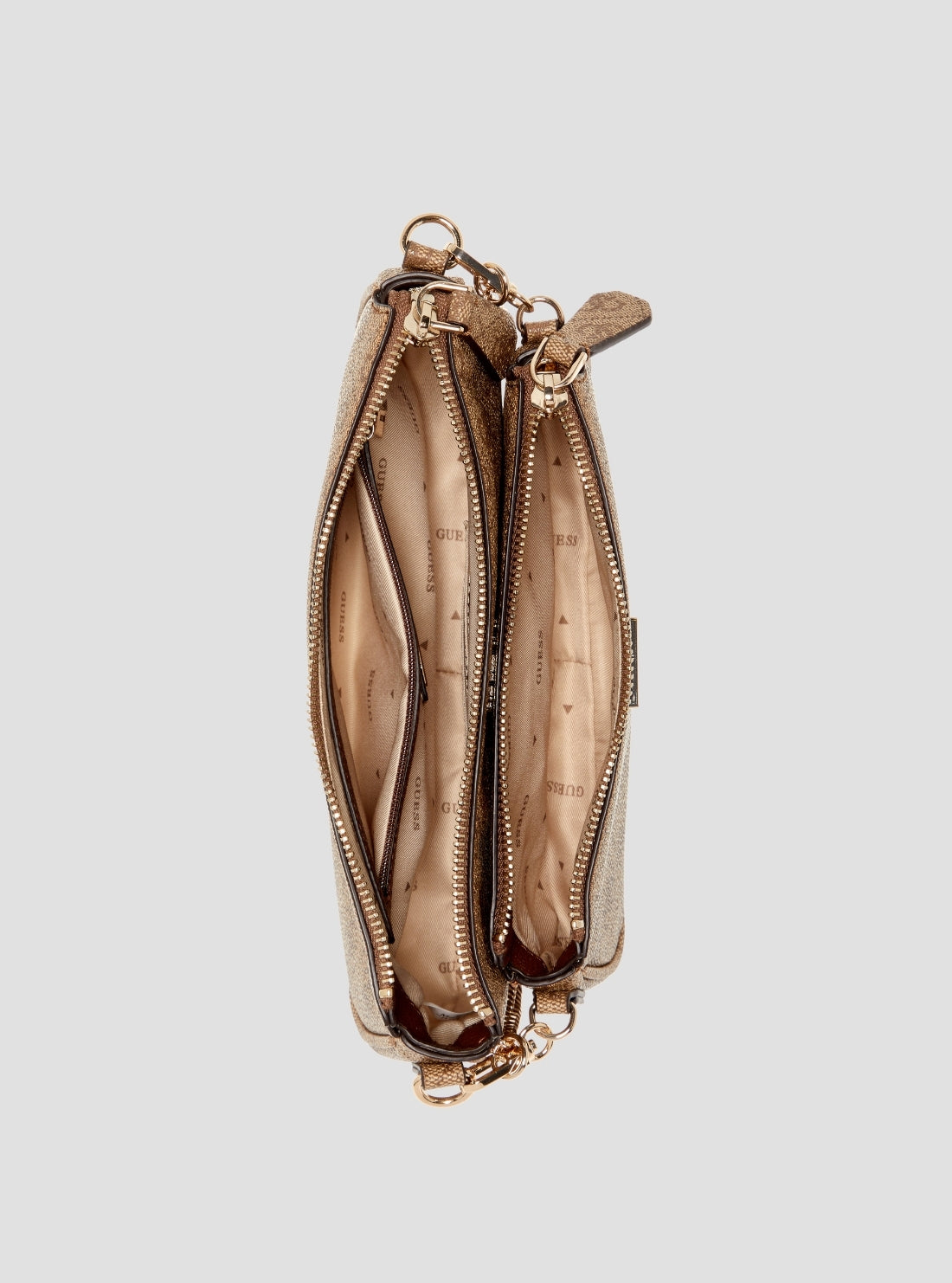 GUESS Womens Brown Logo Noelle Double Pouch Crossbody Bag BG967271 Front View GUESS Womens Brown Logo Noelle Double Pouch Crossbody Bag BG967271 Front Side View GUESS Womens Brown Logo Noelle Double Pouch Crossbody Bag BG967271 Inside View GUESS Womens Brown Logo Noelle Double Pouch Crossbody Bag BG967271 Back View