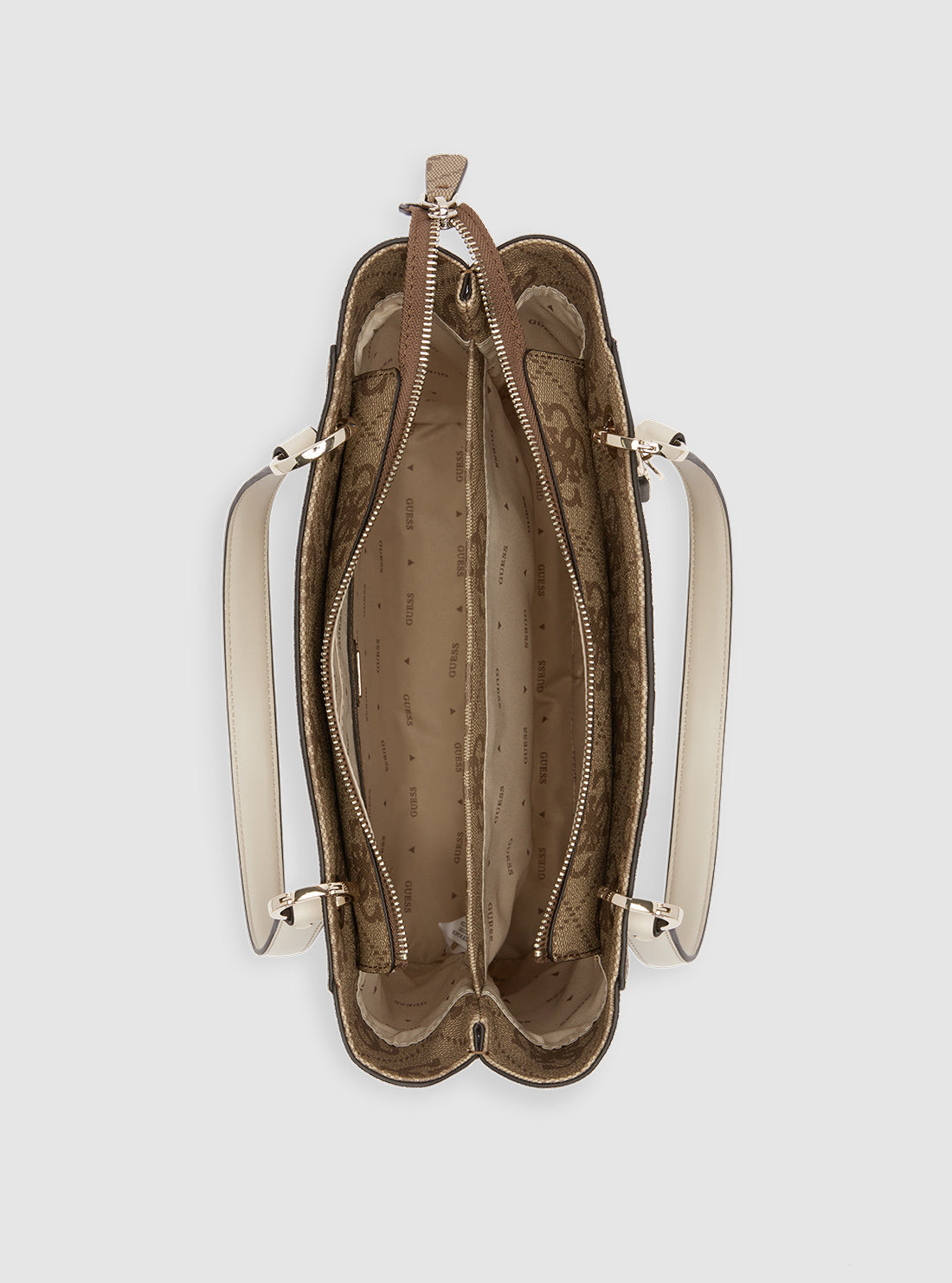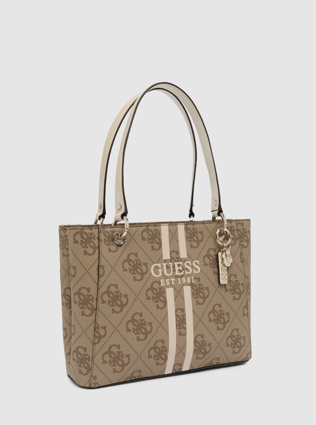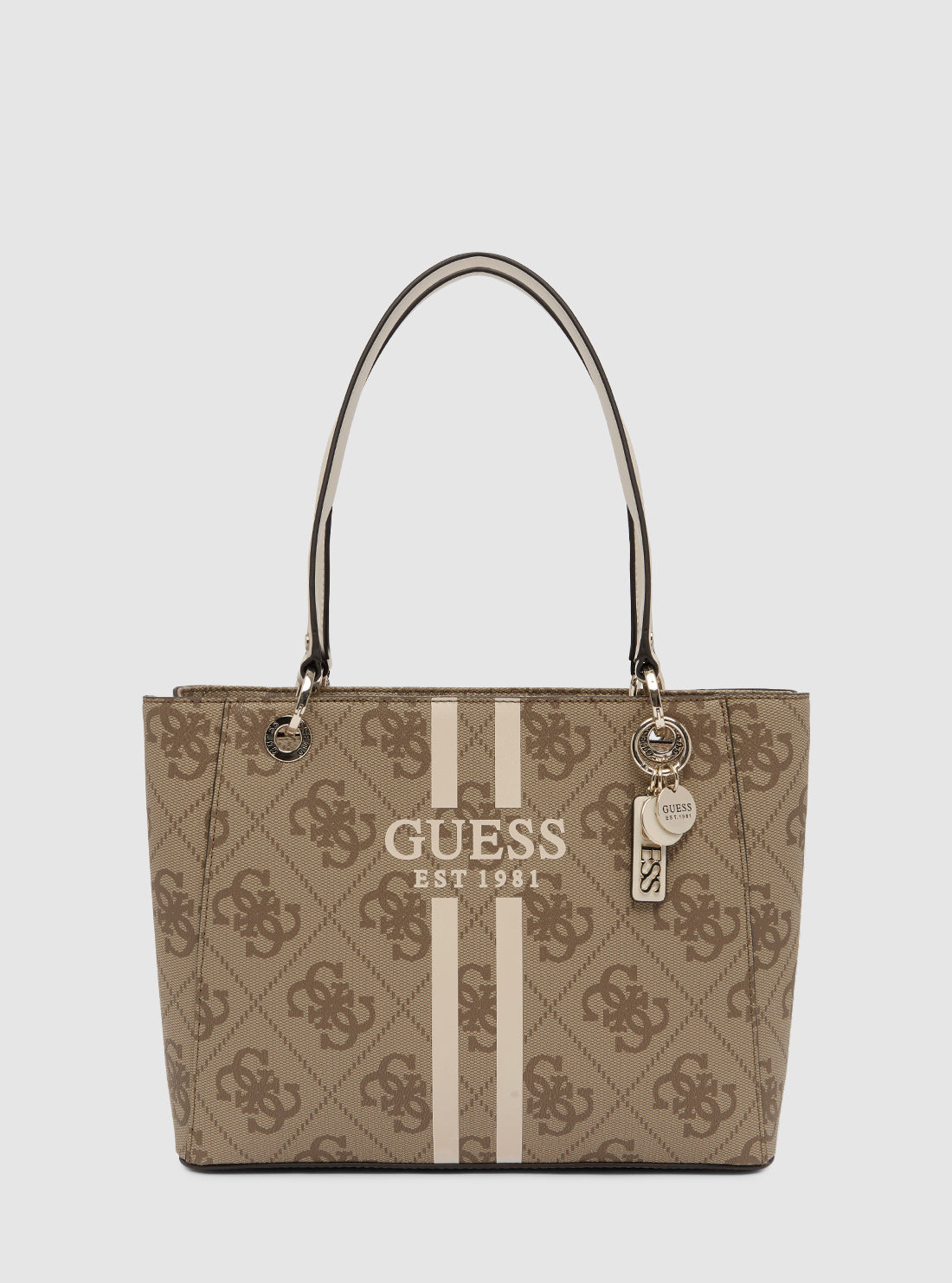 Stand out with the Brown Logo Noelle Small Tote Bag by GUESS! This tote features a bold oversized logo design and stylish shiny gold hardware. Carry your belongings in style with this eye-catching and fashion-forward piece.