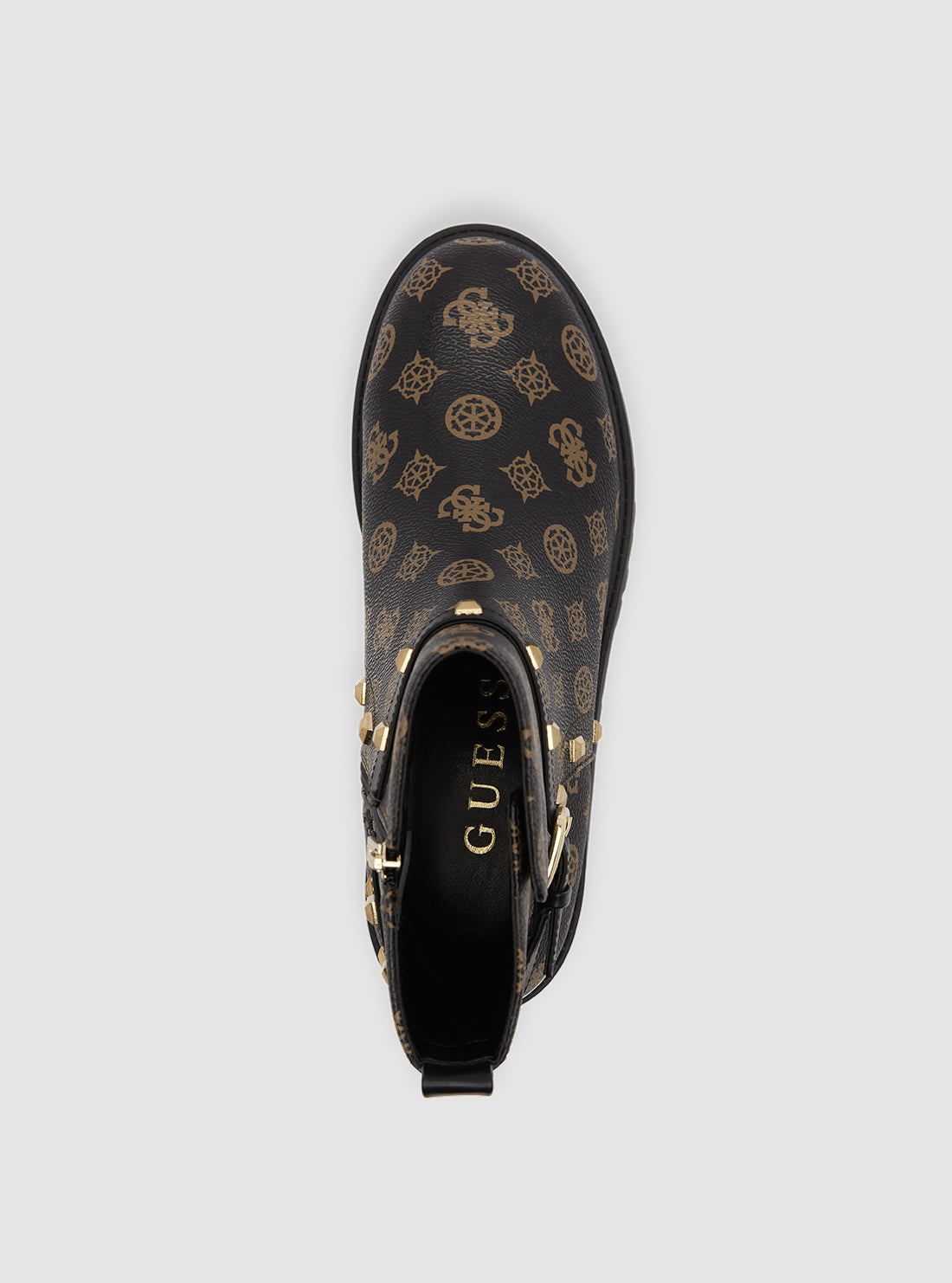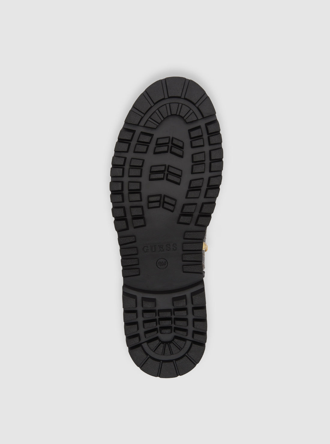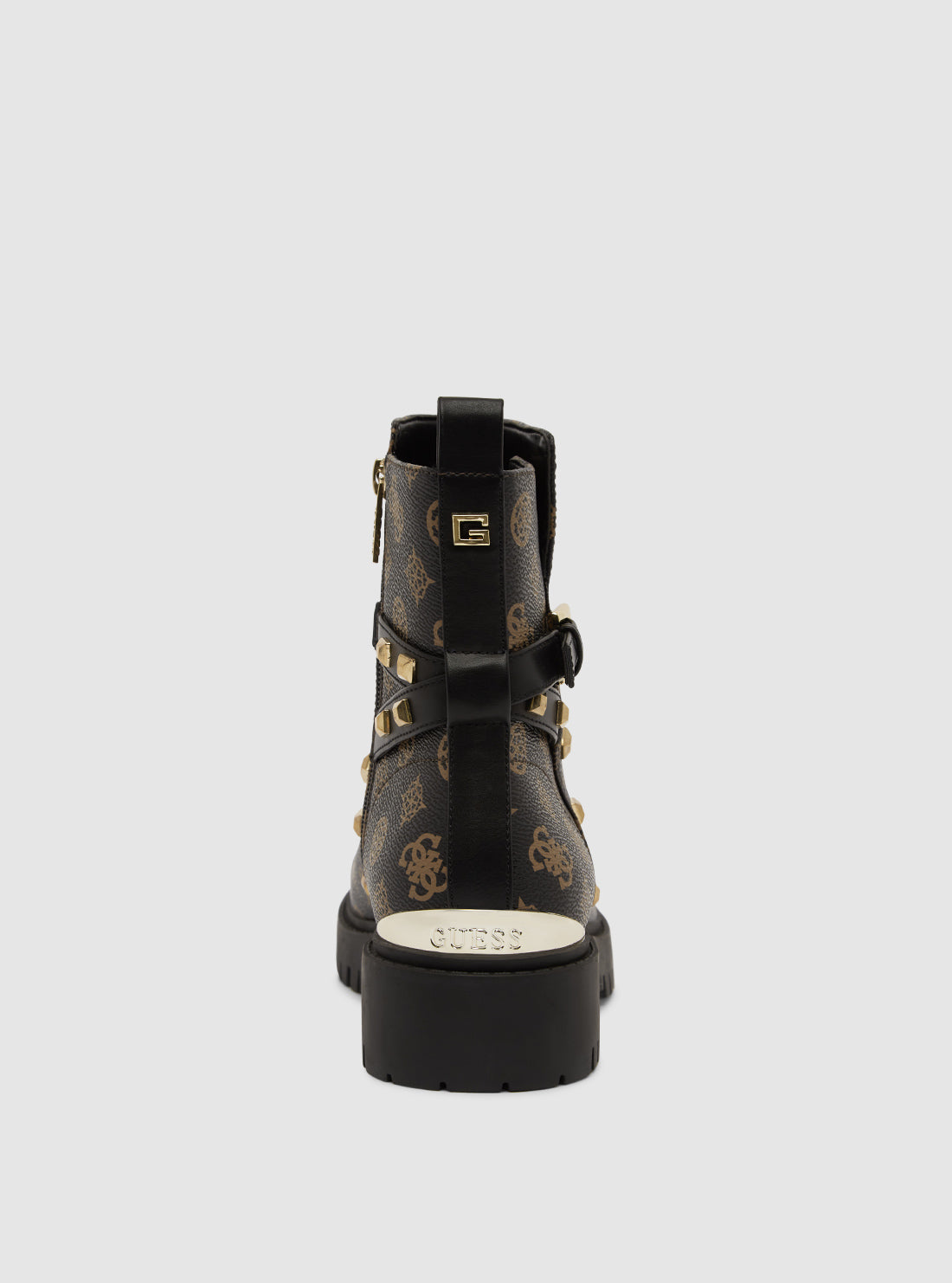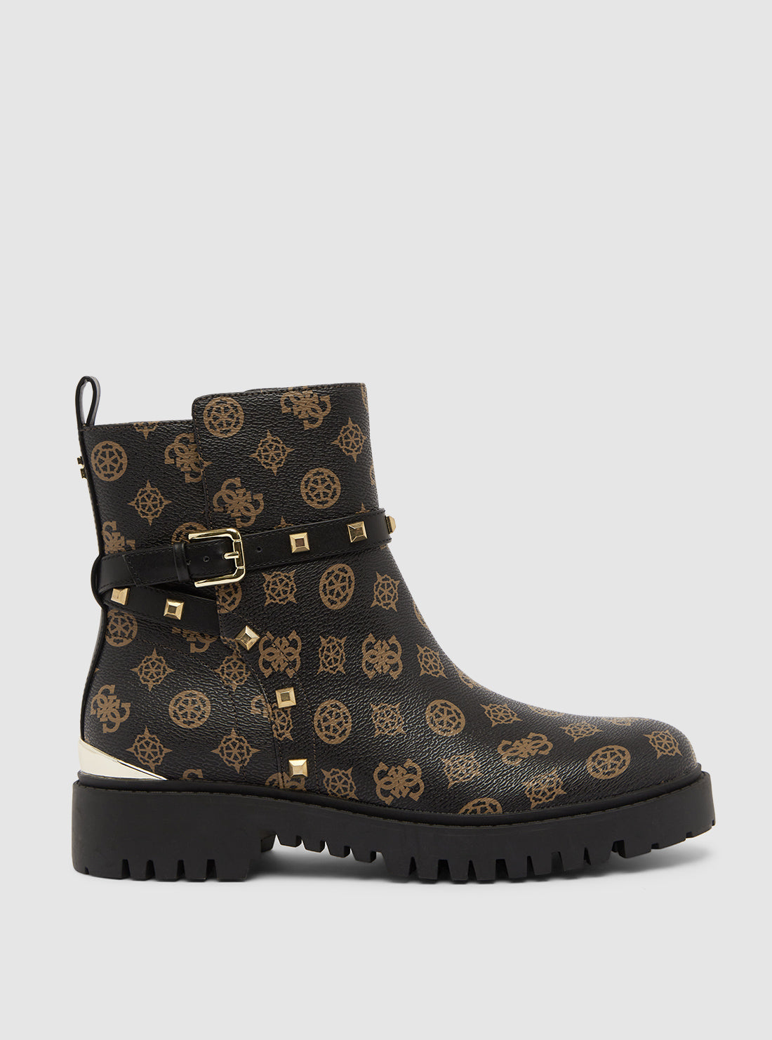 Elevate your footwear collection with the Brown Logo Oliy Boots by GUESS. Designed in classic black, these booties feature a comfortable round toe and a flat heel for effortless all-day wear. The chunky heel adds a stylish edge, while the decorative buckle enhances their appeal. With a convenient zipper closure and a heel collar tab for easy on-and-off, these booties are a chic choice for any occasion.