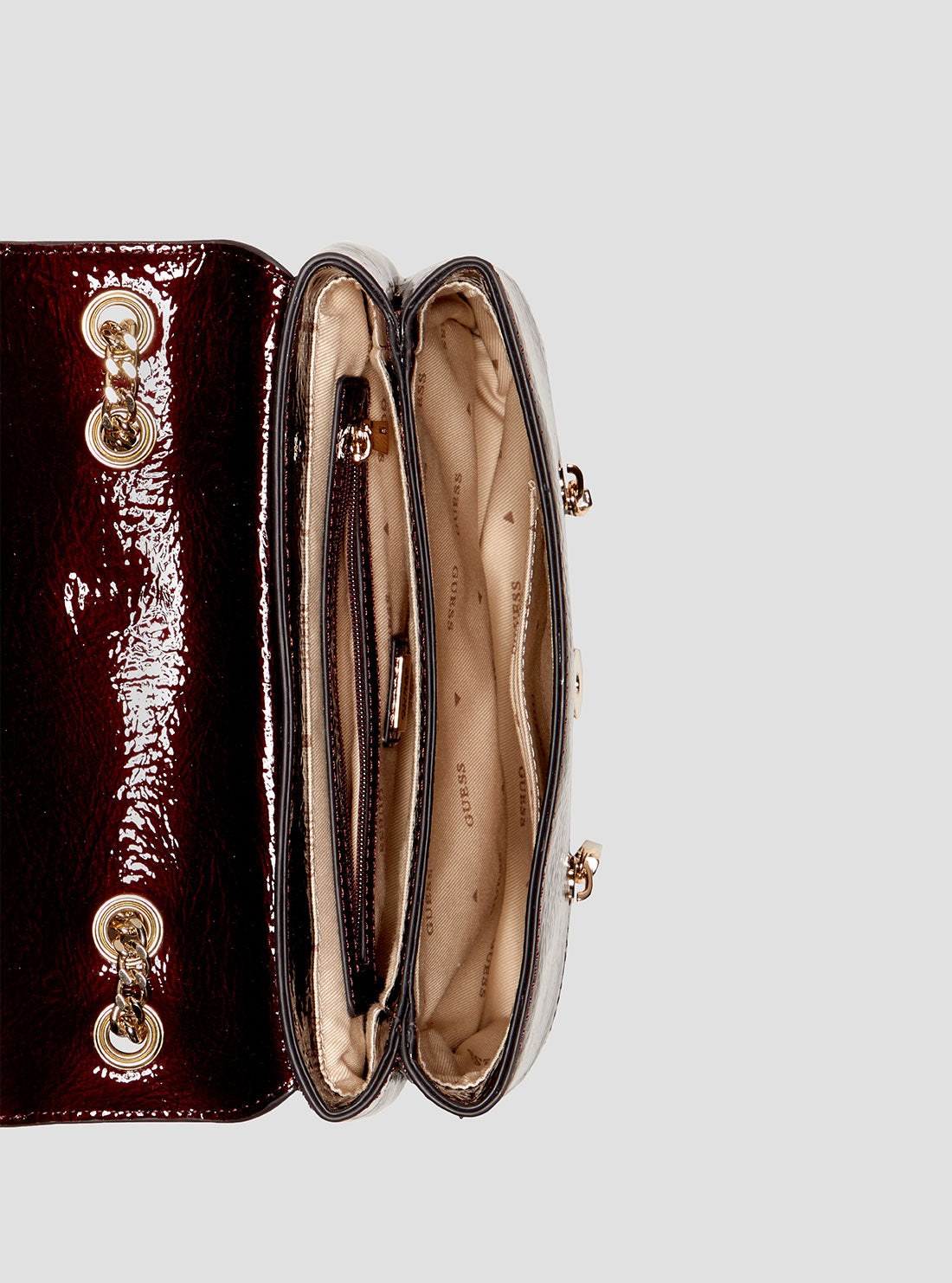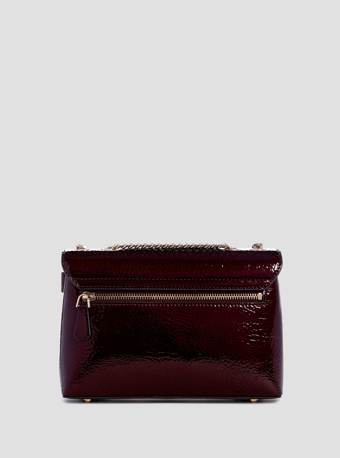 Carry your essentials with style in our Burgundy Trissa bag. The half flap closure and chain crossbody strap offer convenience and a trendy look. With zip details and a shiny gold hardware, this bag is both functional and fashionable. The base is made of Patent PU and the trim is Self, making it a durable and elegant choice.