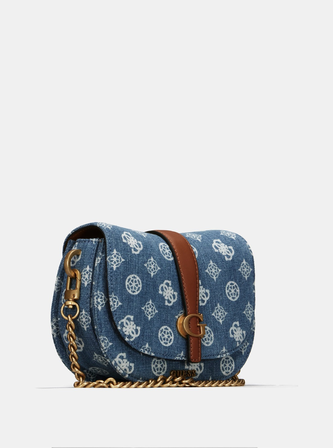 Carry your essentials in style with our Denim Logo Kuba Mini Crossbody Bag. Featuring a half flap closure, adjustable crossbody strap, and chic chain strap, it's perfect for on-the-go fashionistas. The base is made of Peony printed PU with antique gold hardware, adding a touch of elegance to your look.