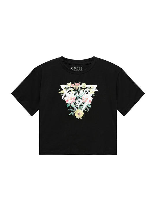 Bring fresh energy to her casual wardrobe with this Eco Black Short Sleeve T-Shirt (7-16). Featuring the iconic GUESS triangle logo reimagined with a floral print overlay, this cropped tee adds a stylish twist to everyday outfits. Made from a soft stretch cotton blend with organic fibers, it’s comfortable and perfect for versatile wear.