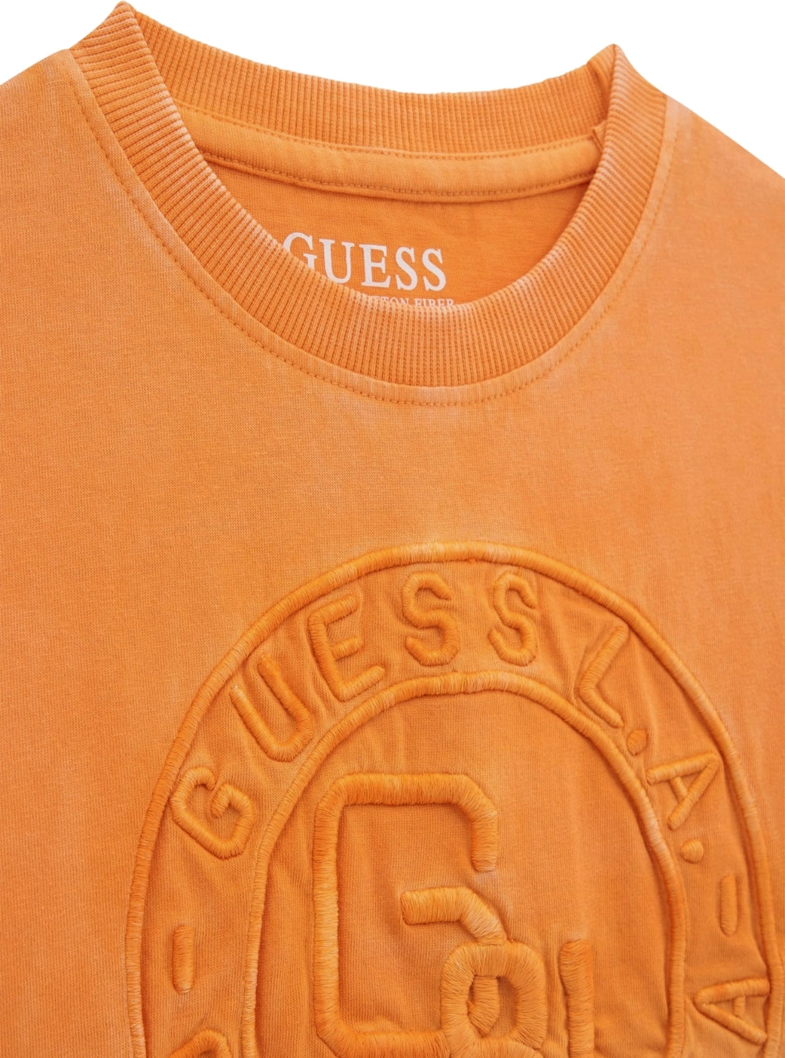 Vibrant and stylish, the Eco Orange Gradient T-Shirt (7-16) delivers standout style with everyday comfort. This crew-neck tee features a bold orange-to-white gradient ombré design and a raised embossed circular “GUESS LA California” logo at the front, complete with a textured “G” emblem at the center. Its lightweight fabric and casual fit make it perfect for all-day wear. Pair with jeans or shorts for an effortlessly cool outfit.