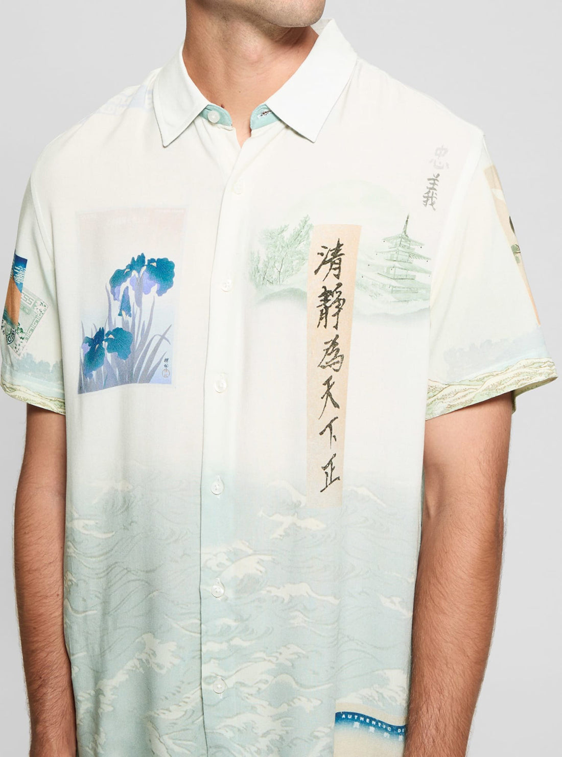 Go and dream in style with the Eco White Daydream Shirt. This short-sleeved shirt features a button-up closure and a playful graphic print. Step out with confidence and a touch of whimsy in this sustainable choice!
