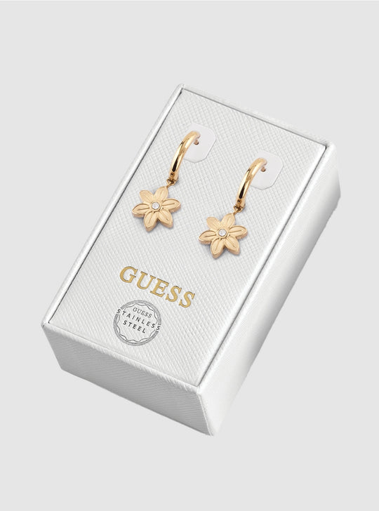 GUESS Womens Gold Flower Huggie Earrings JUBS01839 Full Detail View GUESS Womens Gold Flower Huggie Earrings JUBS01839 Front View