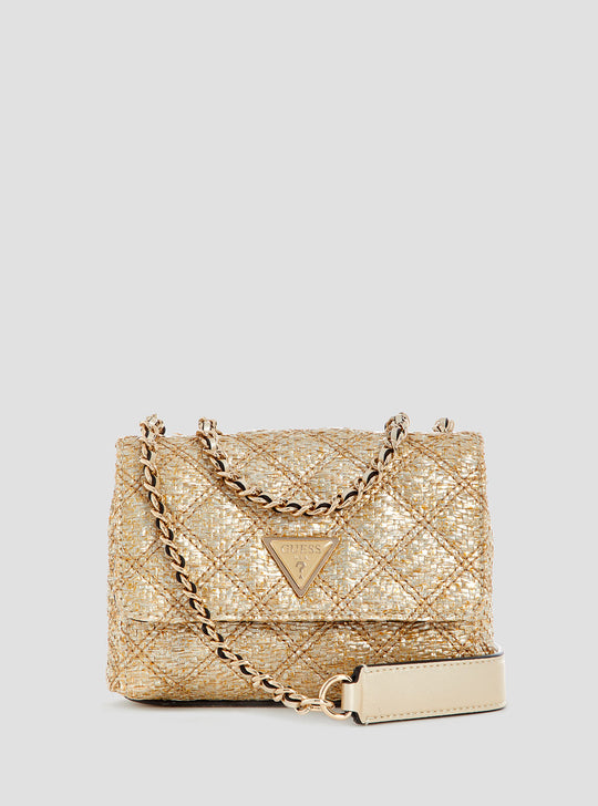 Elevate your style with the Gold Giully Mini Convertible Crossbody Bag by GUESS. Featuring a chic half flap closure and a chain crossbody strap, it keeps all your essentials within reach. The base is crafted from quilted metallic straw, while the metallic PU trim and shiny gold hardware add the perfect touch of glamour.