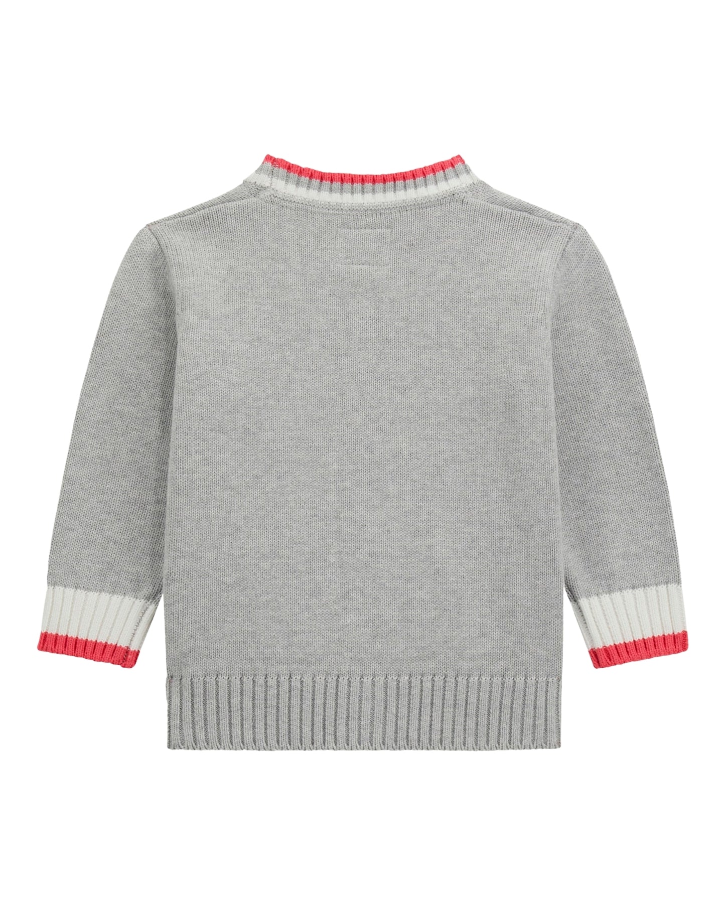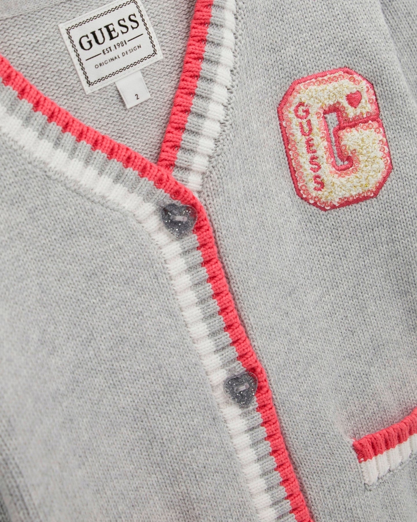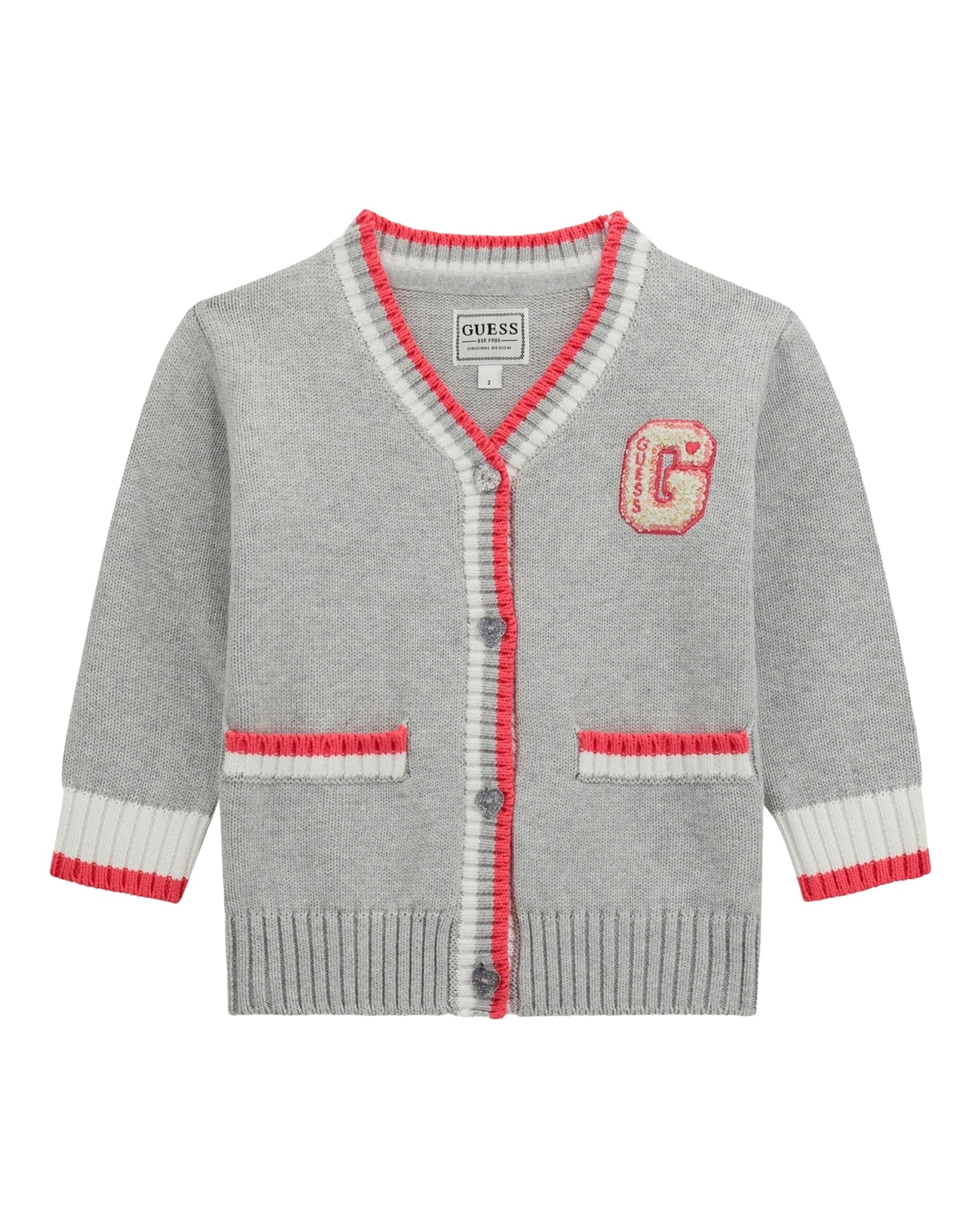 This V-neck grey long sleeve cardigan from GUESS Kids features a button-up closure and functional side pockets. Made of 100% cotton, it's soft, breathable, and perfect for everyday wear. Stay cosy and stylish in this grey knit cardigan.
