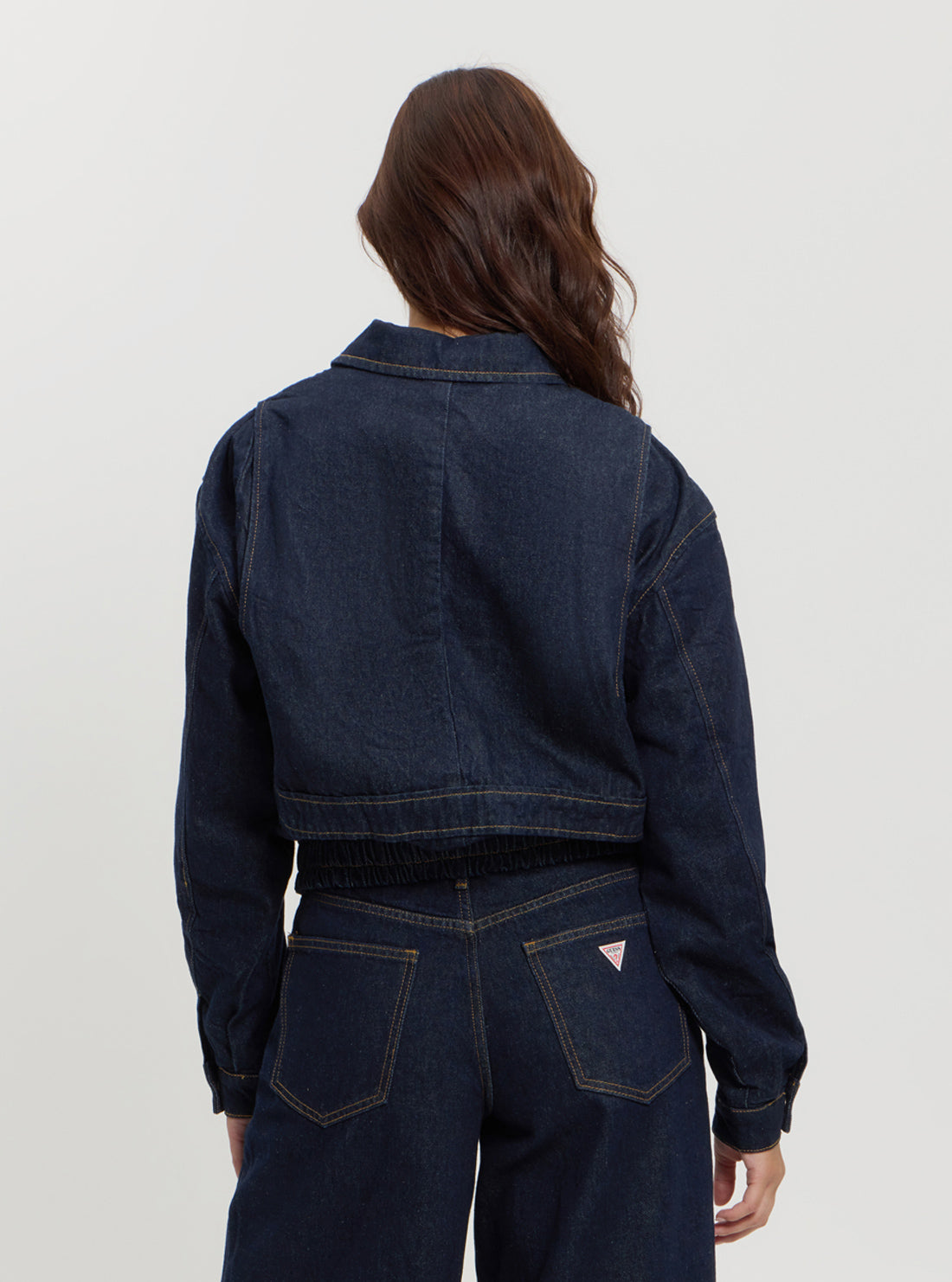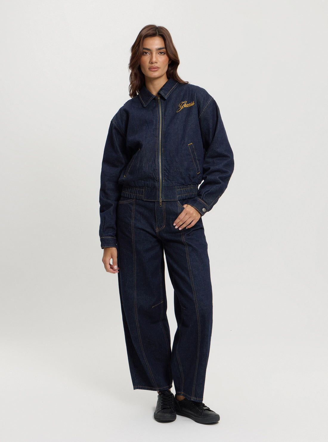 Channel timeless style with the GUESS Originals Blue Denim Bomber Jacket. This vintage-inspired piece boasts a boxy, cropped bomber silhouette crafted from rigid, non-stretch denim. Featuring a collared neckline, welt hand pockets, and a versatile two-way zip closure. Pair with the matching pants to complete the look.